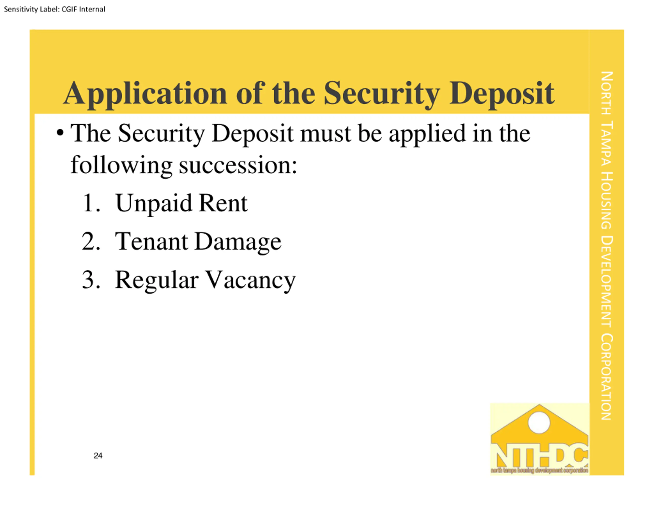 Sensitivity Label: CGIF Internal NORTH TAMPA HOUSING DEVELOPMENT CORPORATION Application of the Security Deposit The Security Deposit must be applied in the followingsuccession: 1. Unpaid Rent 2. Tenant Damage 3. Regular Vacancy 24