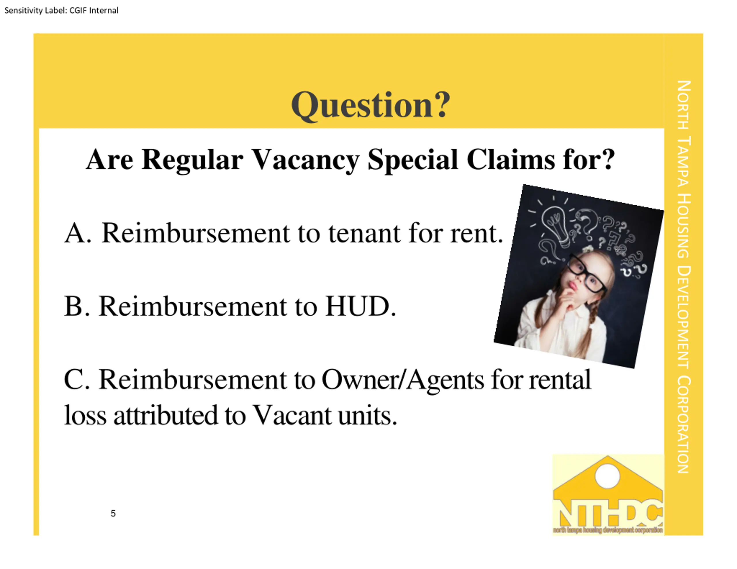 Sensitivity Label: CGIF Internal NORTH TAMPA HOUSING DEVELOPMENT CORPORATION Question? Are Regular Vacancy Special Claims for? A. Reimbursement to tenant for rent. B. Reimbursement to HUD. C. Reimbursement to Owner/Agents for rental loss attributed to Vacant units. 5