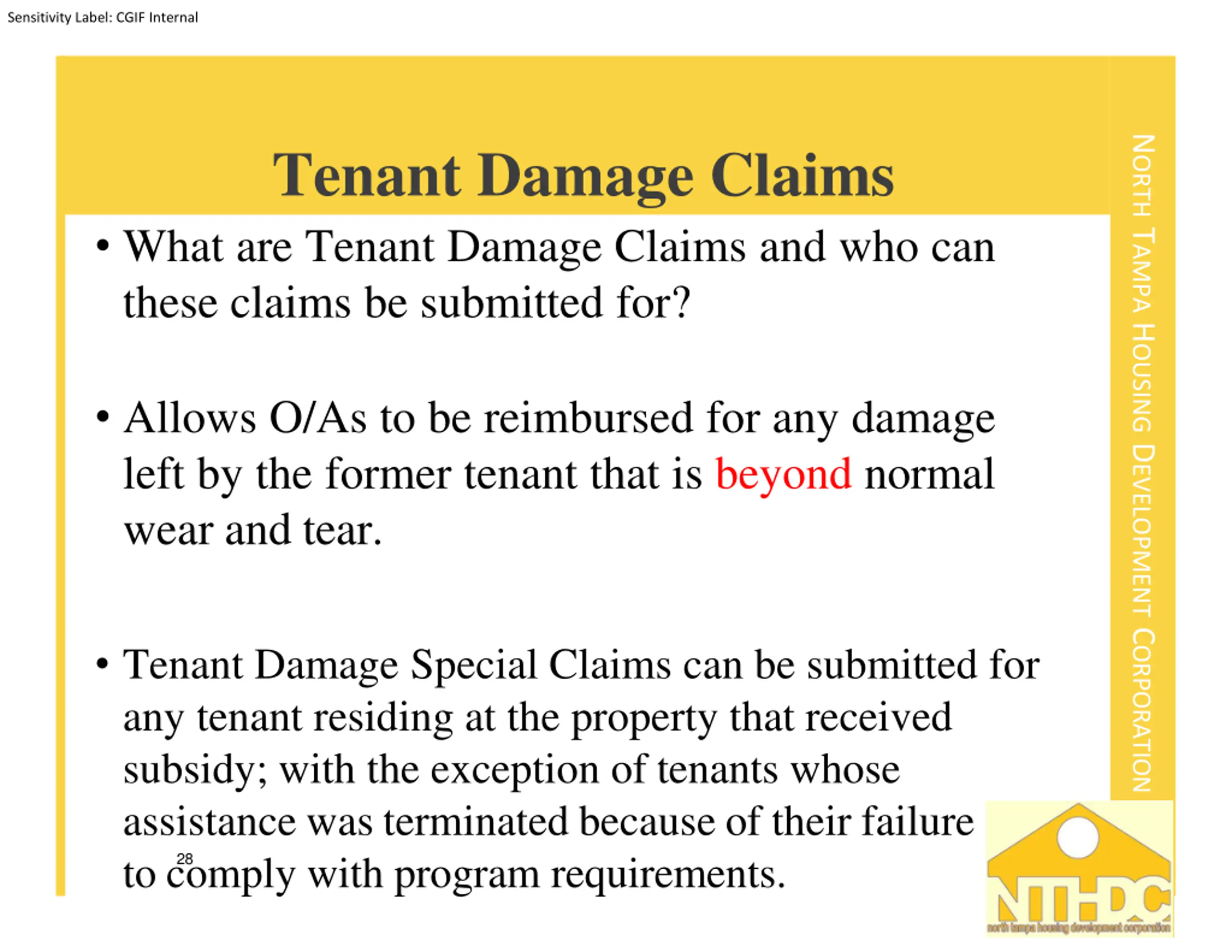 Sensitivity Label: CGIF Internal NORTH TAMPA HOUSING DEVELOPMENT CORPORATION Tenant Damage Claims What are Tenant Damage Claims and who can these claims be submitted for? Allows O/As to be reimbursed for any damage left by the former tenant that is beyond normal wear and tear. Tenant Damage Special Claims can be submitted for any tenant residing at the property that received subsidy; with the exception of tenants whose assistance was terminated because of their failure to comply with program requirements. 28