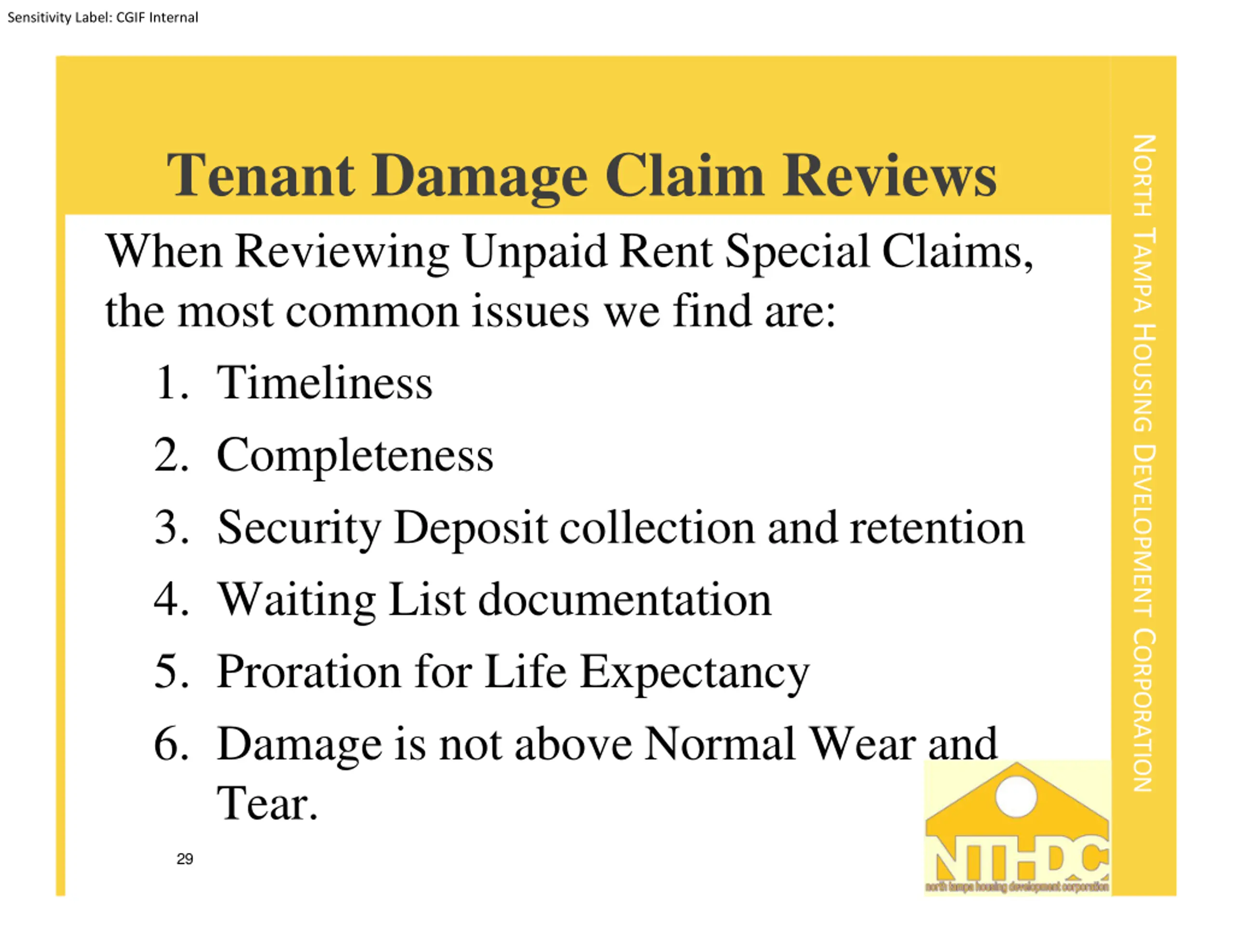 Sensitivity Label: CGIF Internal NORTH TAMPA HOUSING DEVELOPMENT CORPORATION Tenant Damage Claim Reviews When Reviewing Unpaid Rent Special Claims, the most common issues we find are: 1. Timeliness 2. Completeness 3. Security Deposit collection and retention 4. Waiting List documentation 5. Proration for Life Expectancy 6. Damage is not above Normal Wear and Tear. 29