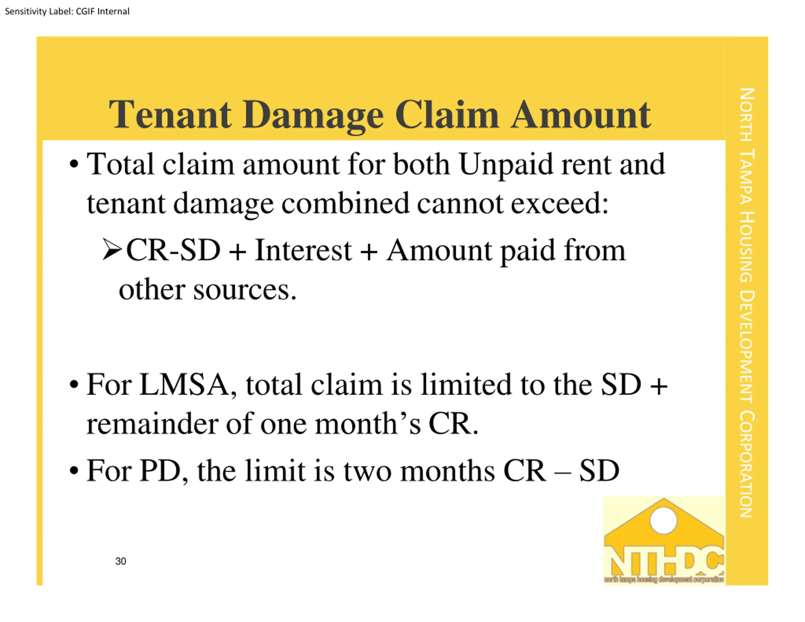 Sensitivity Label: CGIF Internal NORTH TAMPA HOUSING DEVELOPMENT CORPORATION Tenant Damage Claim Amount Total claim amount for both Unpaid rent and tenant damage combined cannot exceed: CR-SD + Interest + Amount paid from other sources. For LMSA, total claim is limited to the SD + remainder of one month s CR. For PD, the limit is two months CR SD 30