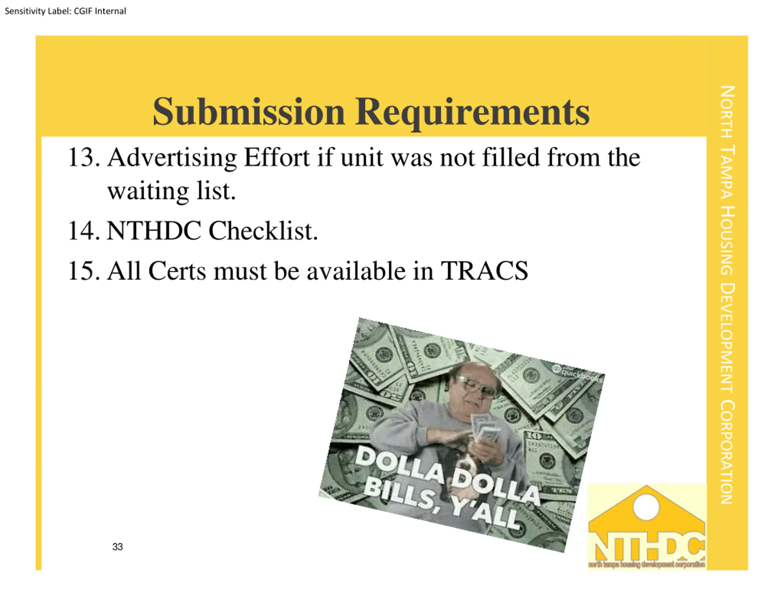 Sensitivity Label: CGIF Internal NORTH TAMPA HOUSING DEVELOPMENT CORPORATION Submission Requirements 13.Advertising Effort if unit was not filled from the waiting list. 14.NTHDC Checklist. 15.All Certs must be available in TRACS 33