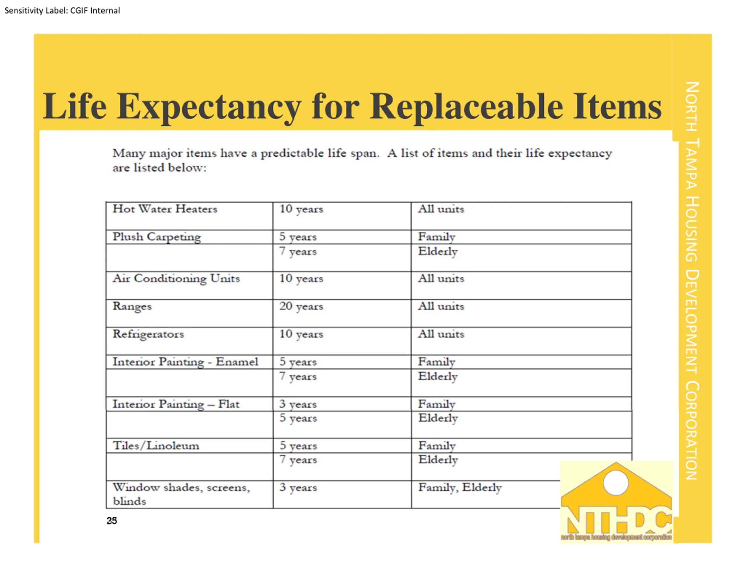 Sensitivity Label: CGIF Internal NORTH TAMPA HOUSING DEVELOPMENT CORPORATION Life Expectancy for Replaceable Items 35