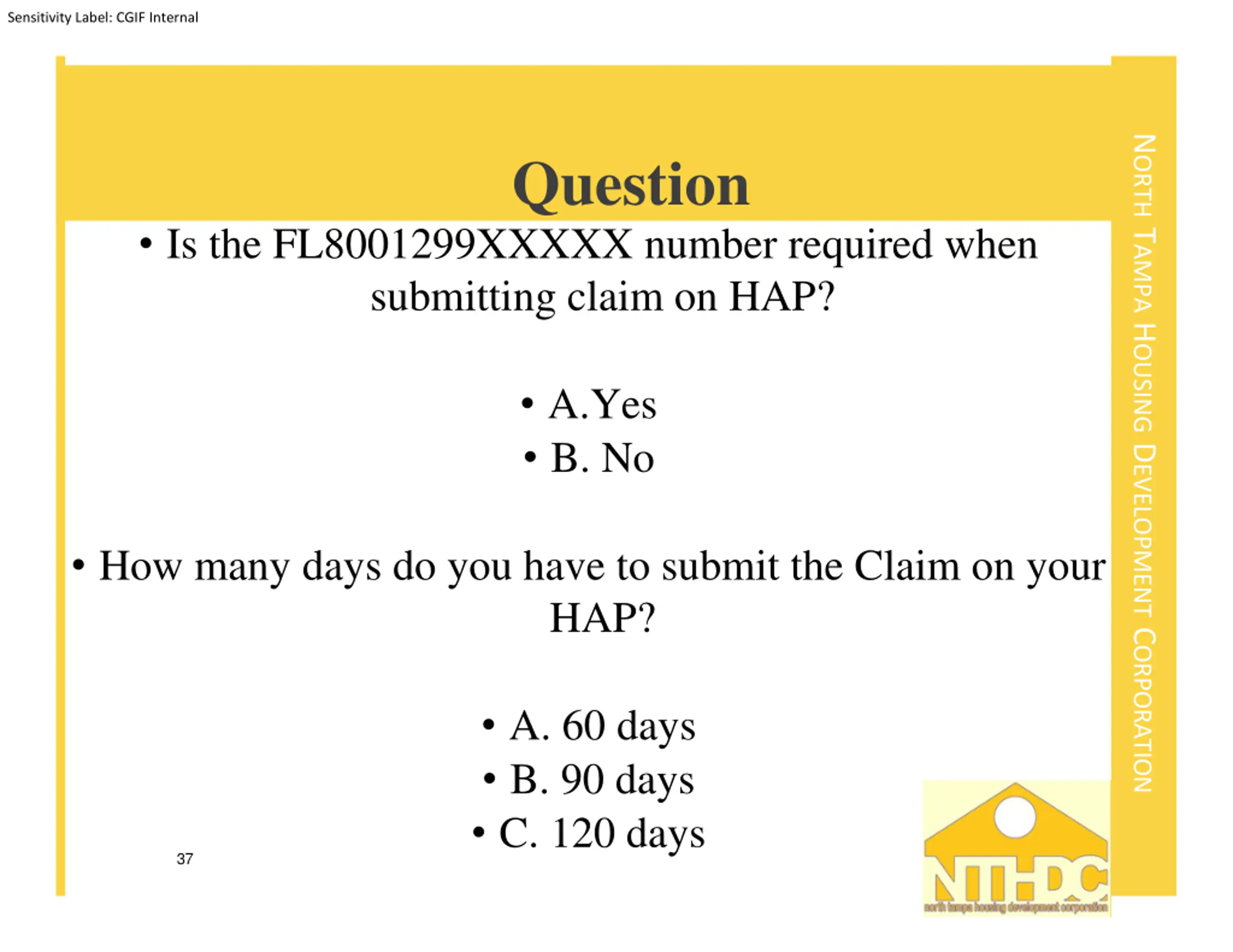 Sensitivity Label: CGIF Internal NORTH TAMPA HOUSING DEVELOPMENT CORPORATION Question Is the FL8001299XXXXX number required when submitting claim on HAP? A.Yes B. No How many days do you have to submit the Claim on your HAP? A. 60 days B. 90 days C. 120 days 37