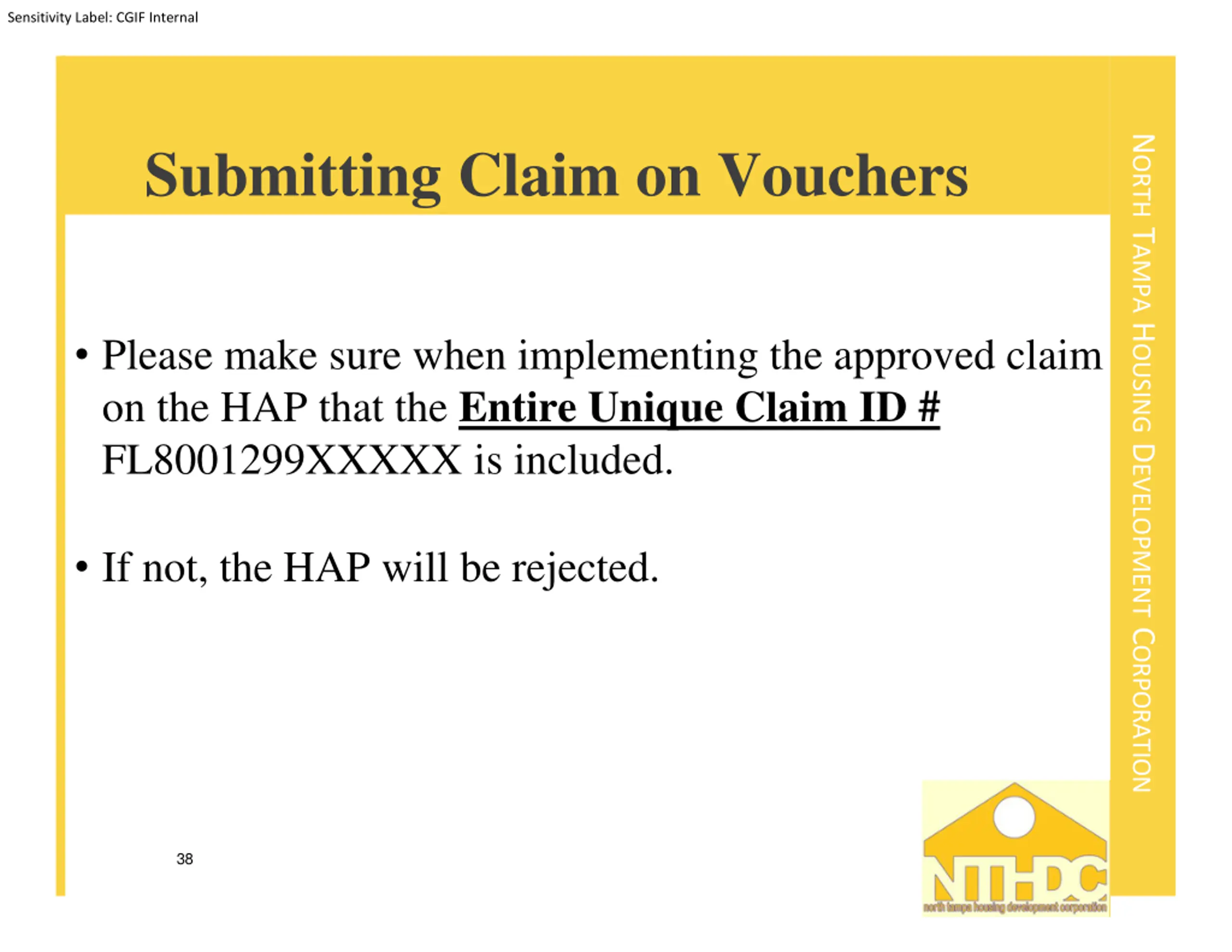 Sensitivity Label: CGIF Internal NORTH TAMPA HOUSING DEVELOPMENT CORPORATION Submitting Claim on Vouchers Please make sure when implementing the approved claim on the HAP that the Entire Unique Claim ID # FL8001299XXXXX is included. If not, the HAP will be rejected. 38