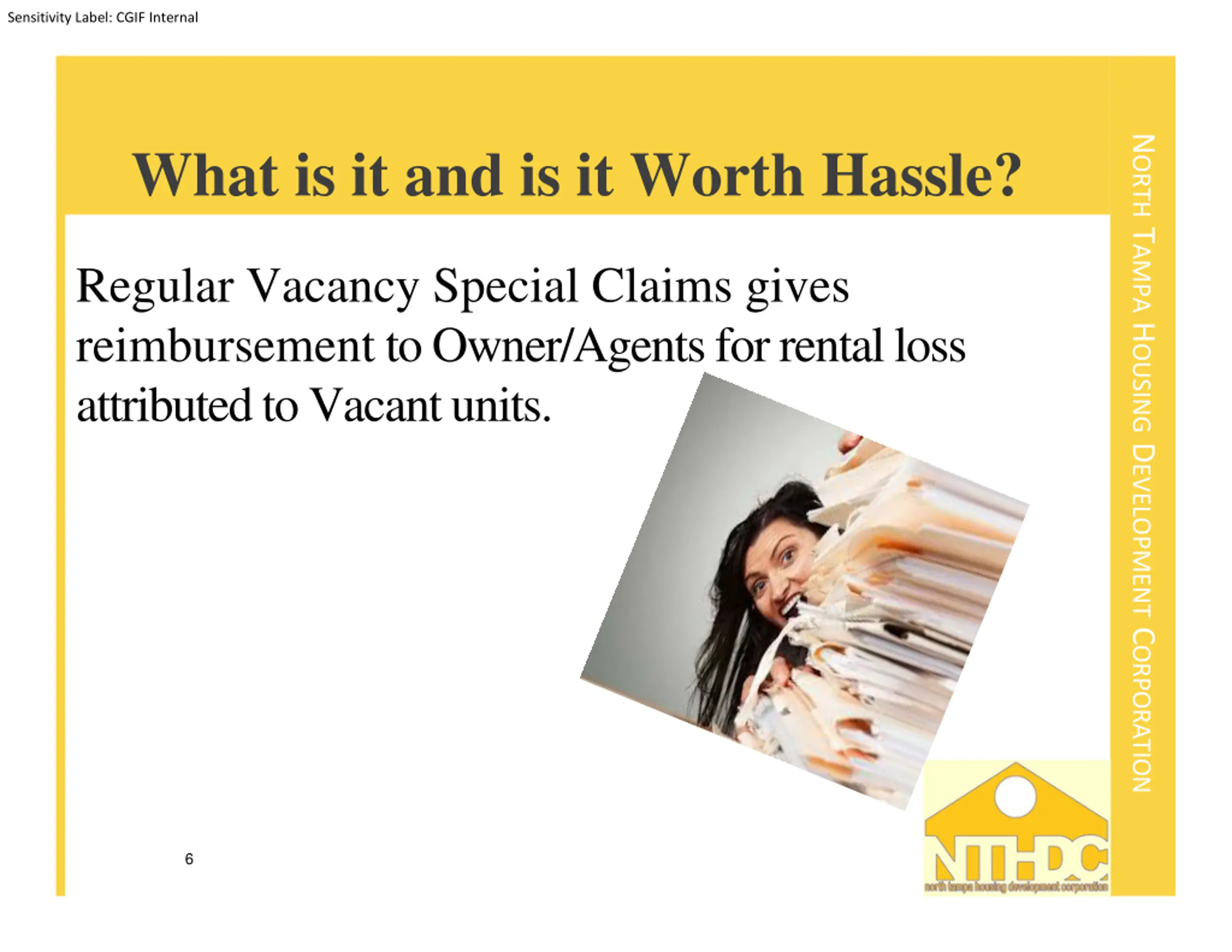 Sensitivity Label: CGIF Internal NORTH TAMPA HOUSING DEVELOPMENT CORPORATION What is it and is it Worth Hassle? Regular Vacancy Special Claims gives reimbursement to Owner/Agents for rental loss attributed to Vacant units. 6