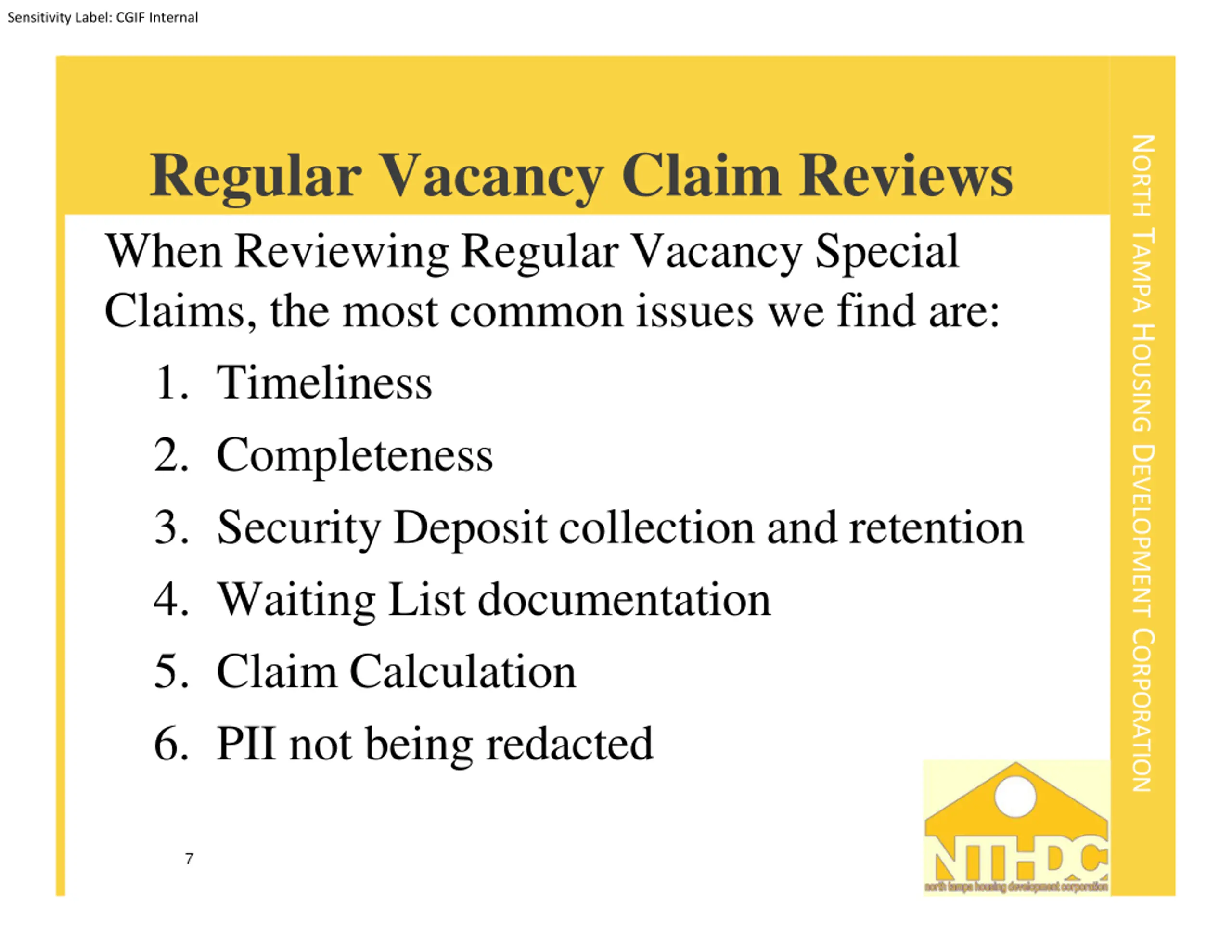 Sensitivity Label: CGIF Internal NORTH TAMPA HOUSING DEVELOPMENT CORPORATION Regular Vacancy Claim Reviews When Reviewing Regular Vacancy Special Claims, the most common issues we find are: 1. Timeliness 2. Completeness 3. Security Deposit collection and retention 4. Waiting List documentation 5. Claim Calculation 6. PII not being redacted 7