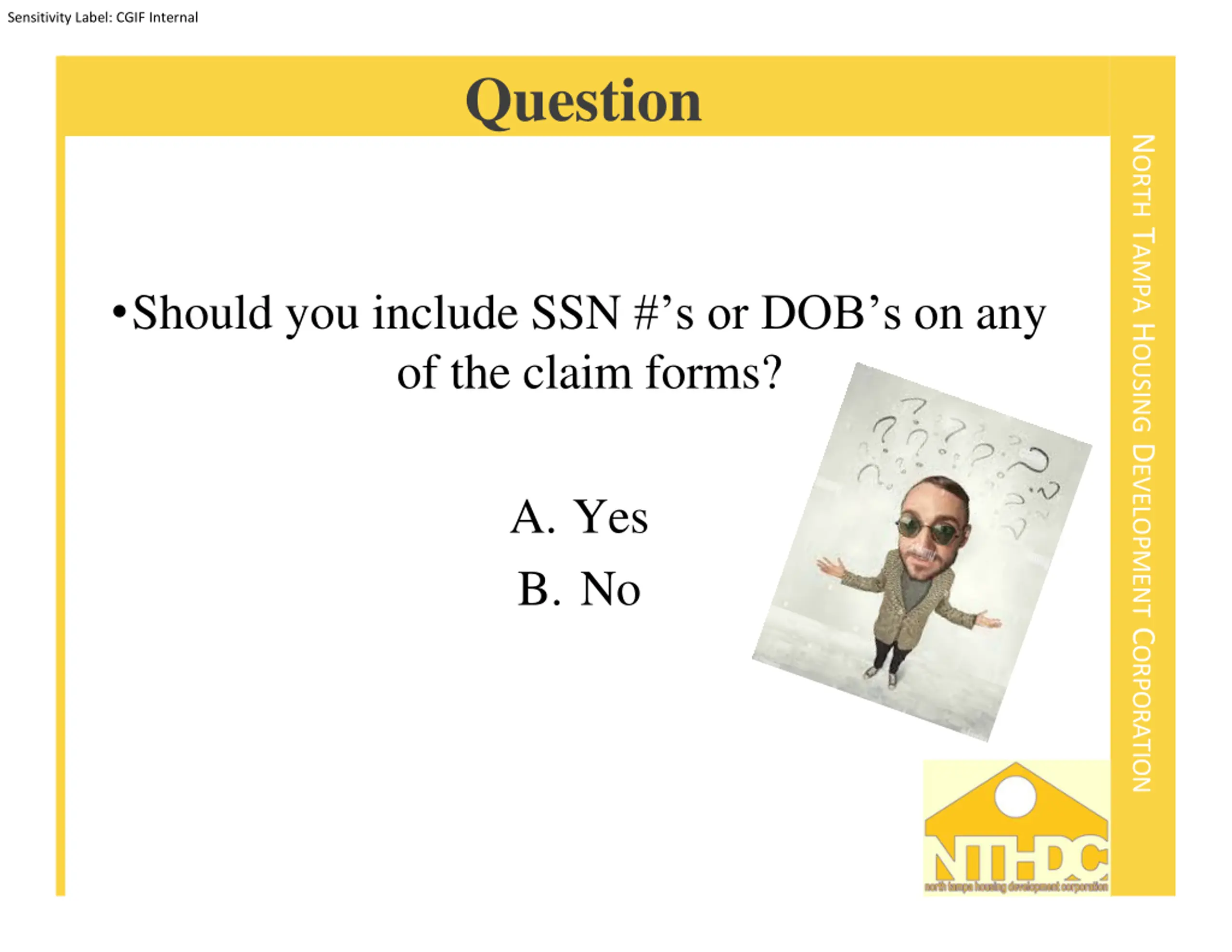Sensitivity Label: CGIF Internal Question NORTH TAMPA HOUSING DEVELOPMENT CORPORATION Should you include SSN # s or DOB s on any of the claim forms? A. Yes B. No