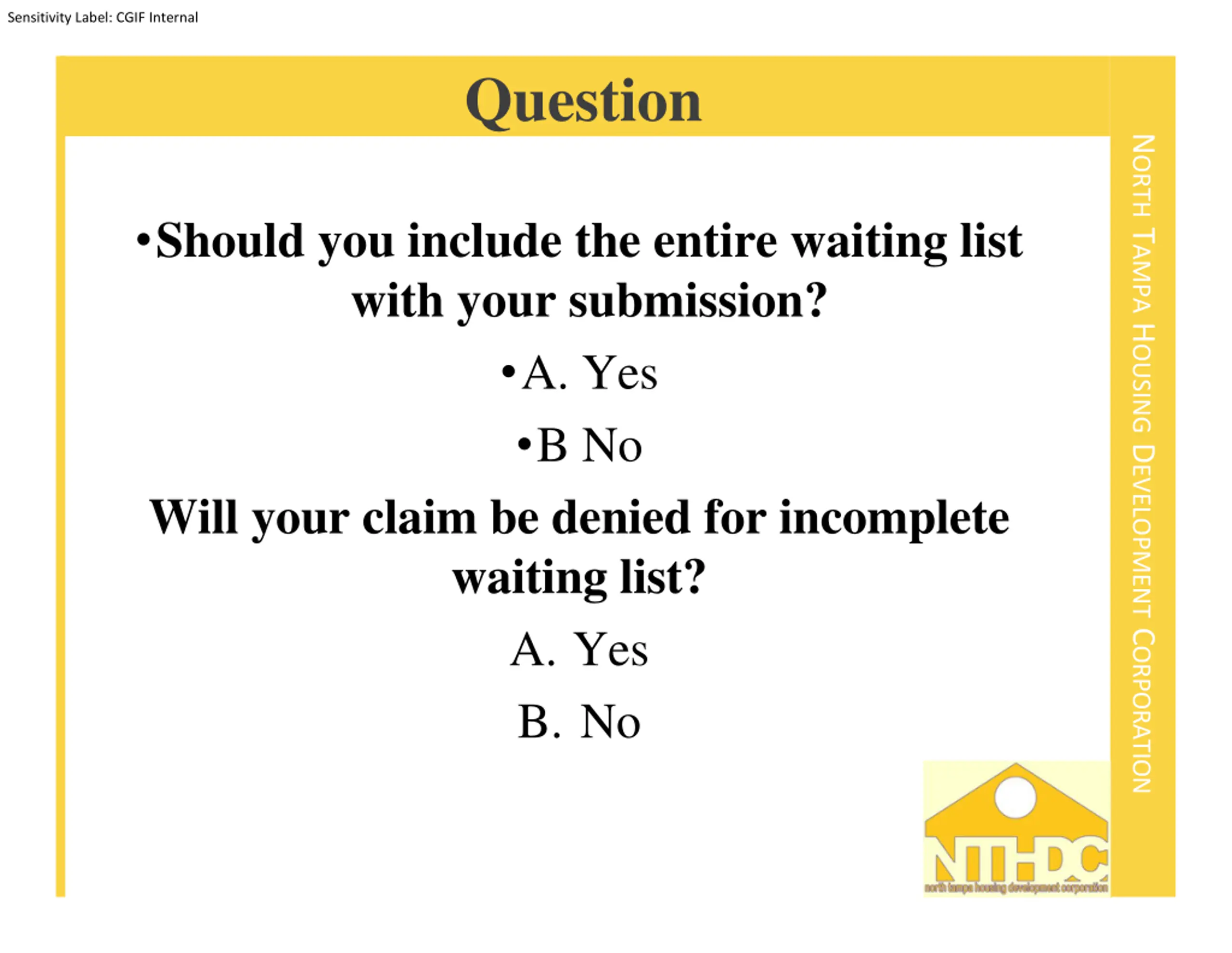 Sensitivity Label: CGIF Internal Question NORTH TAMPA HOUSING DEVELOPMENT CORPORATION Should you include the entire waiting list with your submission? A. Yes B No Will your claim be denied for incomplete waiting list? A. Yes B. No