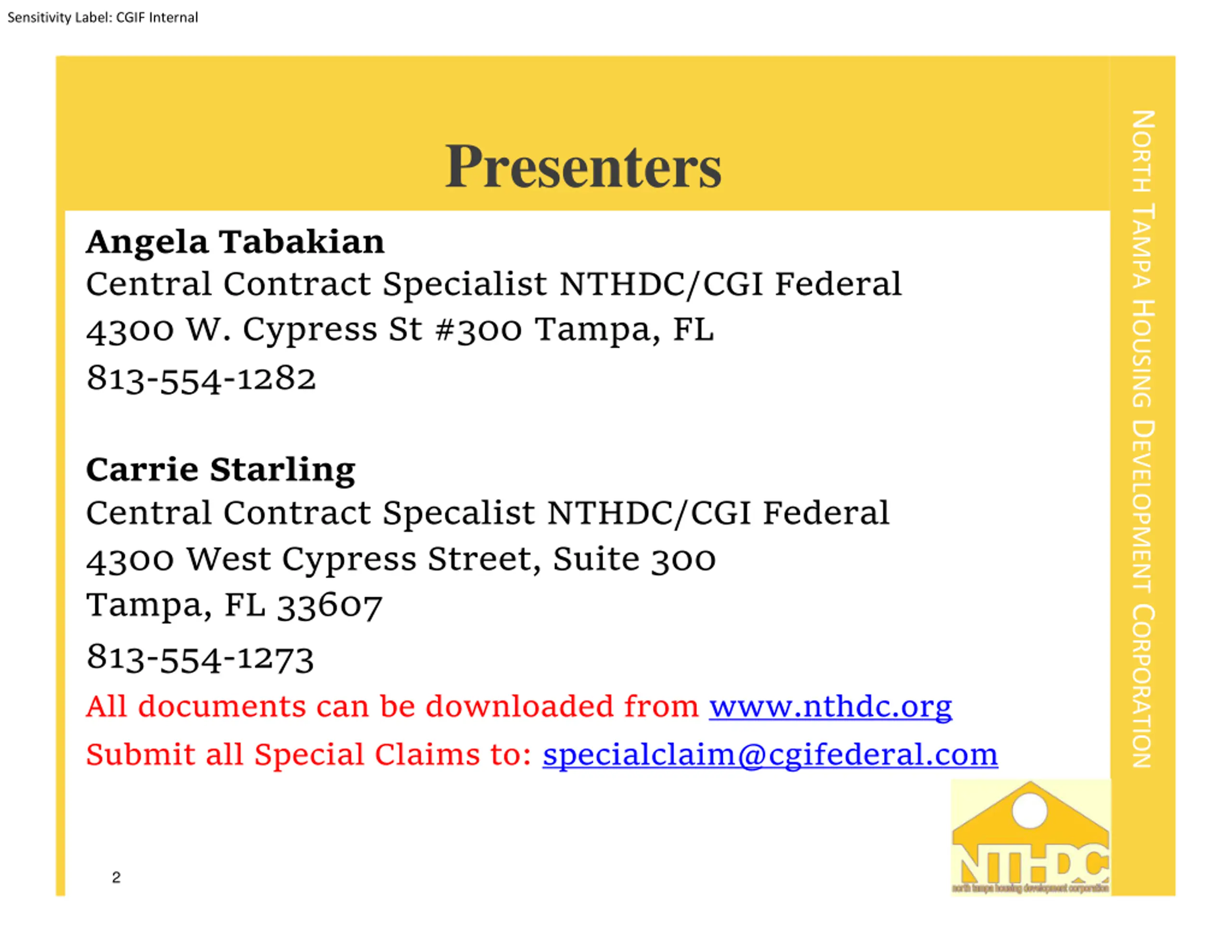 Sensitivity Label: CGIF Internal NORTH TAMPA HOUSING DEVELOPMENT CORPORATION Presenters Angela Tabakian Central Contract Specialist NTHDC/CGI Federal 4300 W. Cypress St #300 Tampa, FL 813-554-1282 Carrie Starling Central Contract Specalist NTHDC/CGI Federal 4300 West Cypress Street, Suite 300 Tampa, FL 33607 813-554-1273 All documents can be downloaded from www.nthdc.org Submit all Special Claims to: specialclaim@cgifederal.com 2