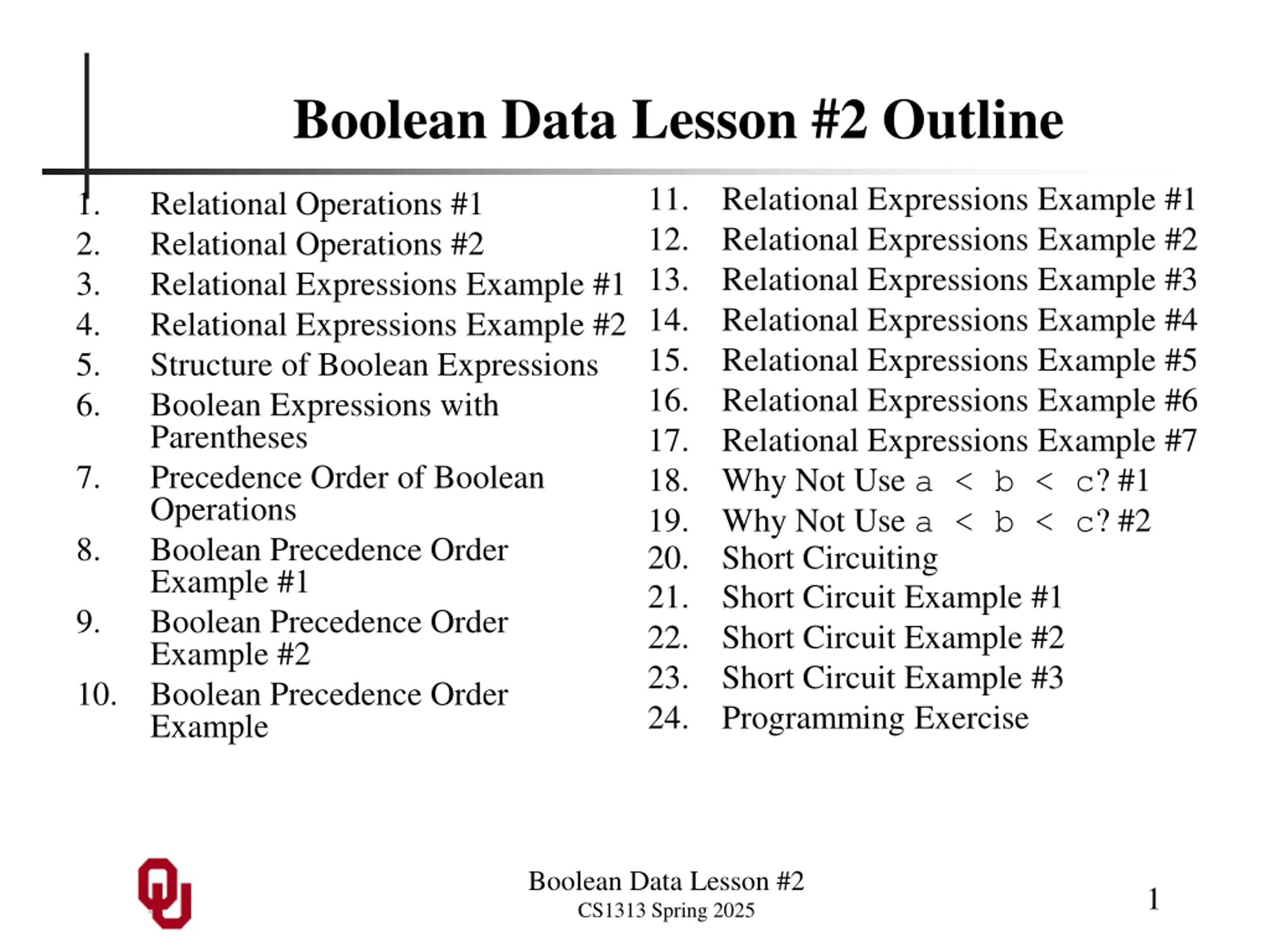 Boolean Data Lesson #2 Outline 11. 12. 13. 14. 15. 16. 17. 18. 19. 20. 21. 22. 23. 24. Relational Expressions Example #1 Relational Expressions Example #2 Relational Expressions Example #3 Relational Expressions Example #4 Relational Expressions Example #5 Relational Expressions Example #6 Relational Expressions Example #7 Why Not Use a < b < c? #1 Why Not Use a < b < c? #2 Short Circuiting Short Circuit Example #1 Short Circuit Example #2 Short Circuit Example #3 Programming Exercise 1. 2. 3. 4. 5. 6. Relational Operations #1 Relational Operations #2 Relational Expressions Example #1 Relational Expressions Example #2 Structure of Boolean Expressions Boolean Expressions with Parentheses Precedence Order of Boolean Operations Boolean Precedence Order Example #1 Boolean Precedence Order Example #2 Boolean Precedence Order Example 7. 8. 9. 10. Boolean Data Lesson #2 CS1313 Spring 2025 1