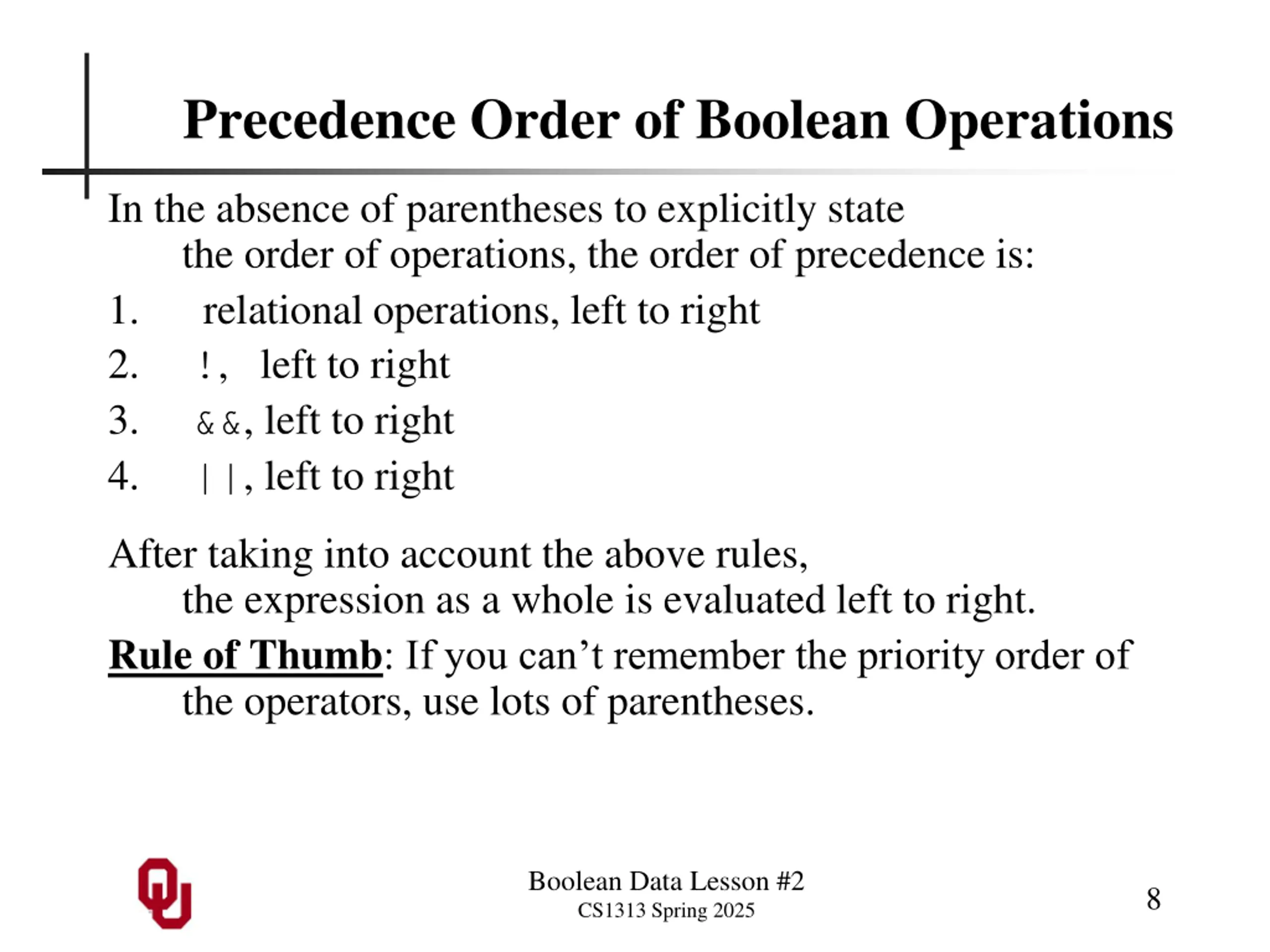 Precedence Order of Boolean Operations In the absence of parentheses to explicitly state the order of operations, the order of precedence is: 1. relational operations, left to right 2. !, left to right 3. &&, left to right 4. ||, left to right After taking into account the above rules, the expression as a whole is evaluated left to right. Rule of Thumb: If you can t remember the priority order of the operators, use lots of parentheses. Boolean Data Lesson #2 CS1313 Spring 2025 8
