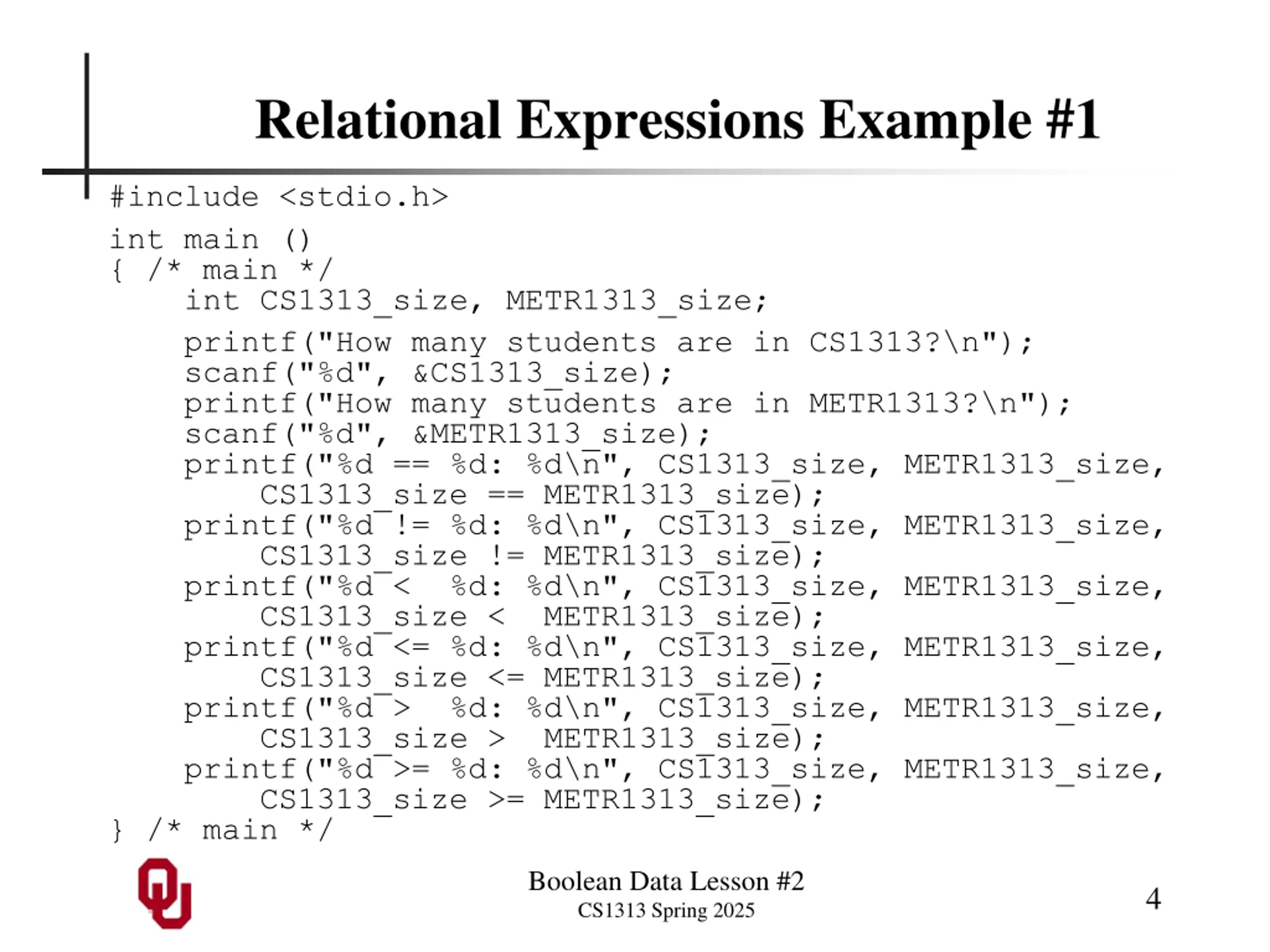 Relational Expressions Example #1 #include <stdio.h> int main () { /* main */ int CS1313_size, METR1313_size; printf("How many students are in CS1313?\n"); scanf("%d", &CS1313_size); printf("How many students are in METR1313?\n"); scanf("%d", &METR1313_size); printf("%d == %d: %d\n", CS1313_size, METR1313_size, CS1313_size == METR1313_size); printf("%d != %d: %d\n", CS1313_size, METR1313_size, CS1313_size != METR1313_size); printf("%d < %d: %d\n", CS1313_size, METR1313_size, CS1313_size < METR1313_size); printf("%d <= %d: %d\n", CS1313_size, METR1313_size, CS1313_size <= METR1313_size); printf("%d > %d: %d\n", CS1313_size, METR1313_size, CS1313_size > METR1313_size); printf("%d >= %d: %d\n", CS1313_size, METR1313_size, CS1313_size >= METR1313_size); } /* main */ Boolean Data Lesson #2 CS1313 Spring 2025 4