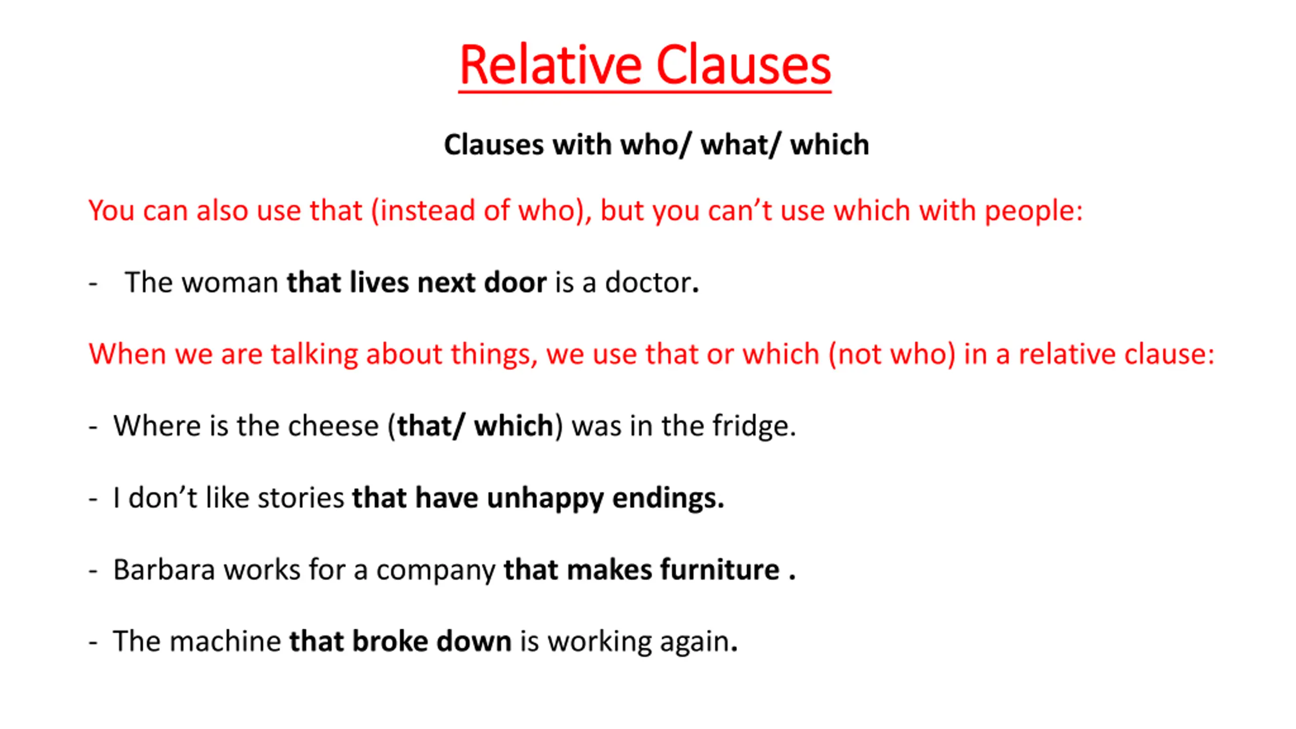 Relative Relative Clauses Clauses Clauses with who/ what/ which You can also use that (instead of who), but you can t use which with people: - The woman that lives next door is a doctor. When we are talking about things, we use that or which (not who) in a relative clause: - Where is the cheese (that/ which) was in the fridge. - I don t like stories that have unhappy endings. - Barbara works for a company that makes furniture . - The machine that broke down is working again.