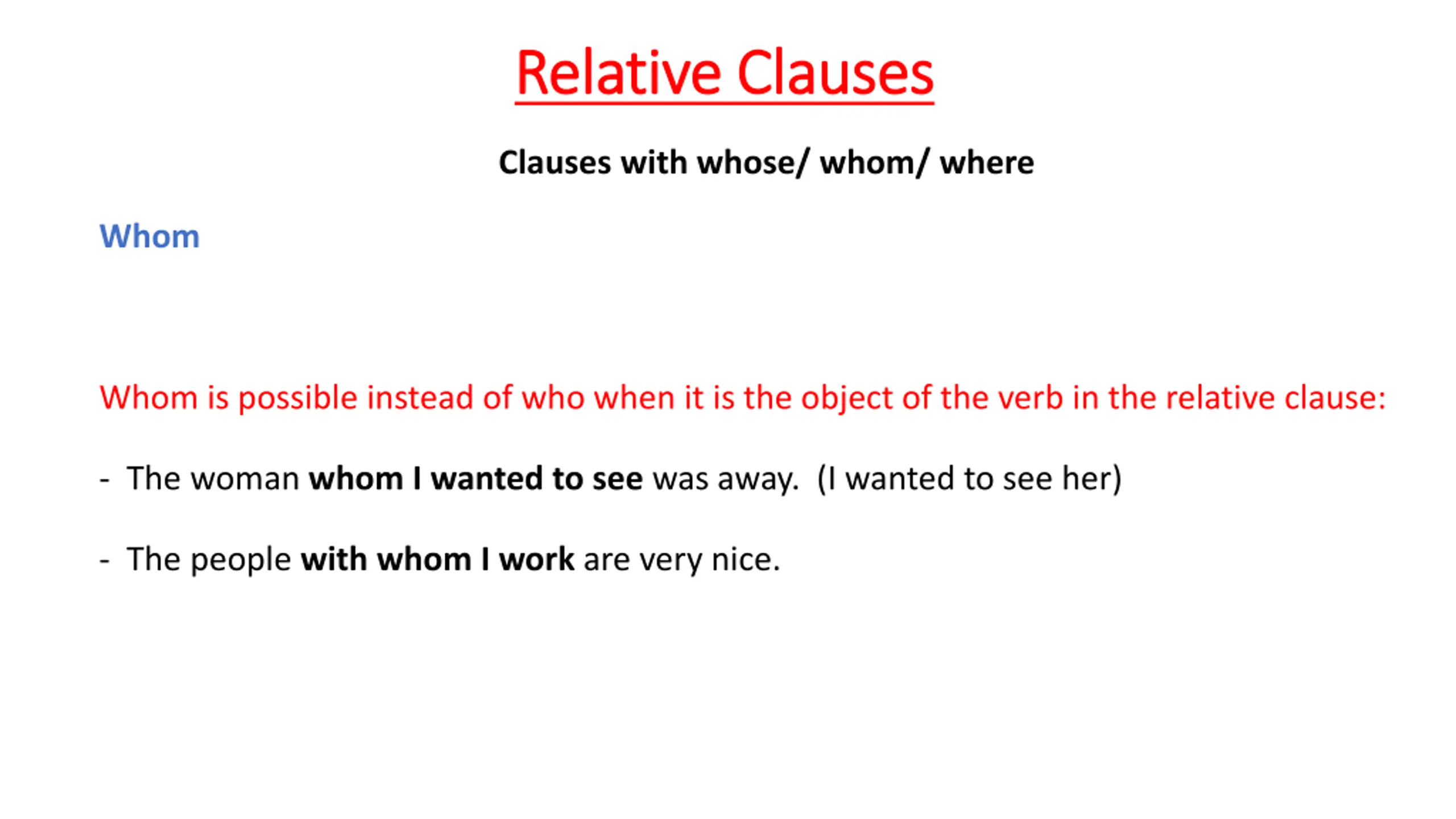 Relative Relative Clauses Clauses Clauses with whose/ whom/ where Whom Whom is possible instead of who when it is the object of the verb in the relative clause: - The woman whom I wanted to see was away. (I wanted to see her) - The people with whom I work are very nice.