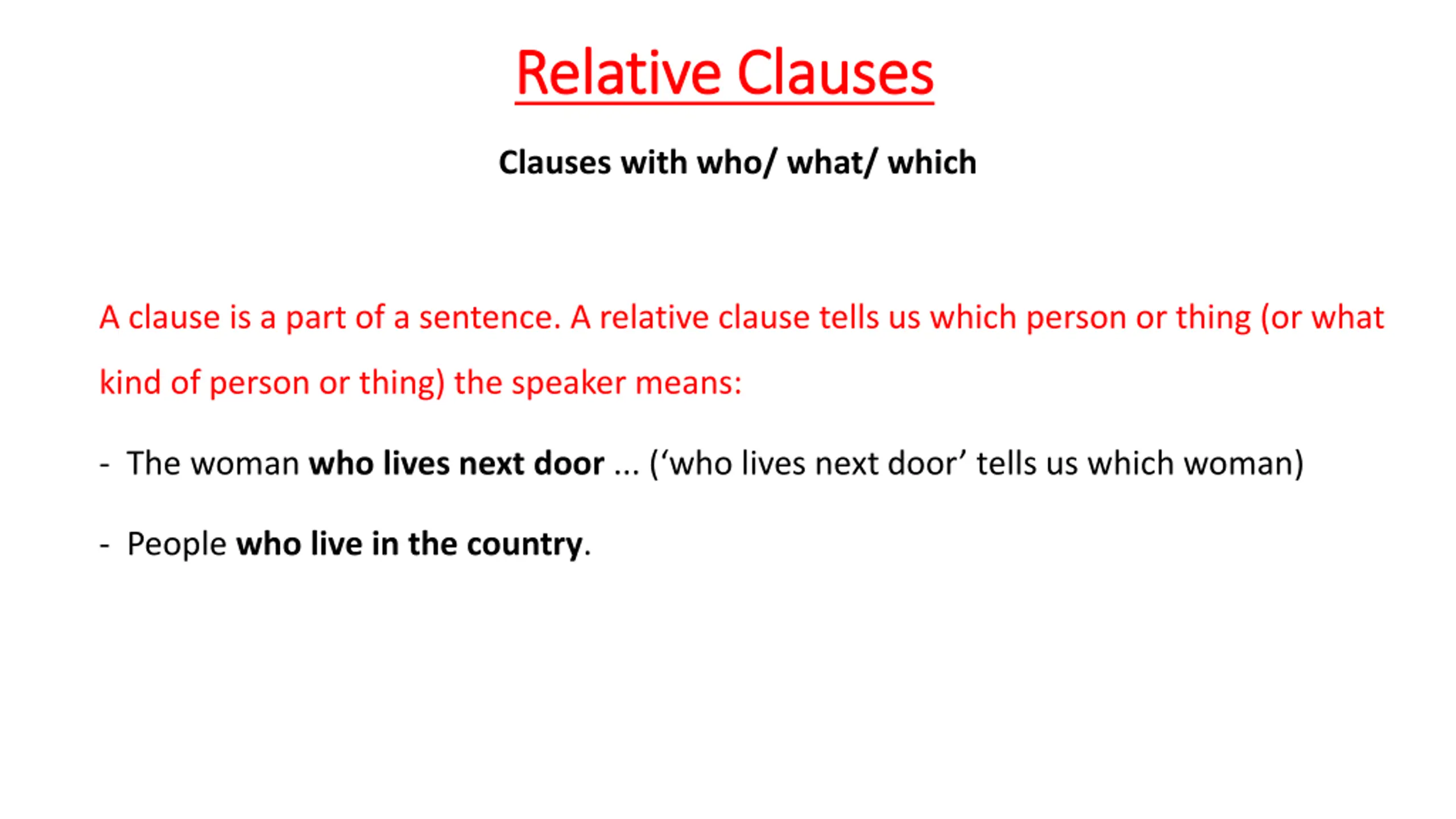 Relative Relative Clauses Clauses Clauses with who/ what/ which A clause is a part of a sentence. A relative clause tells us which person or thing (or what kind of person or thing) the speaker means: - The woman who lives next door ... ( who lives next door tells us which woman) - People who live in the country.