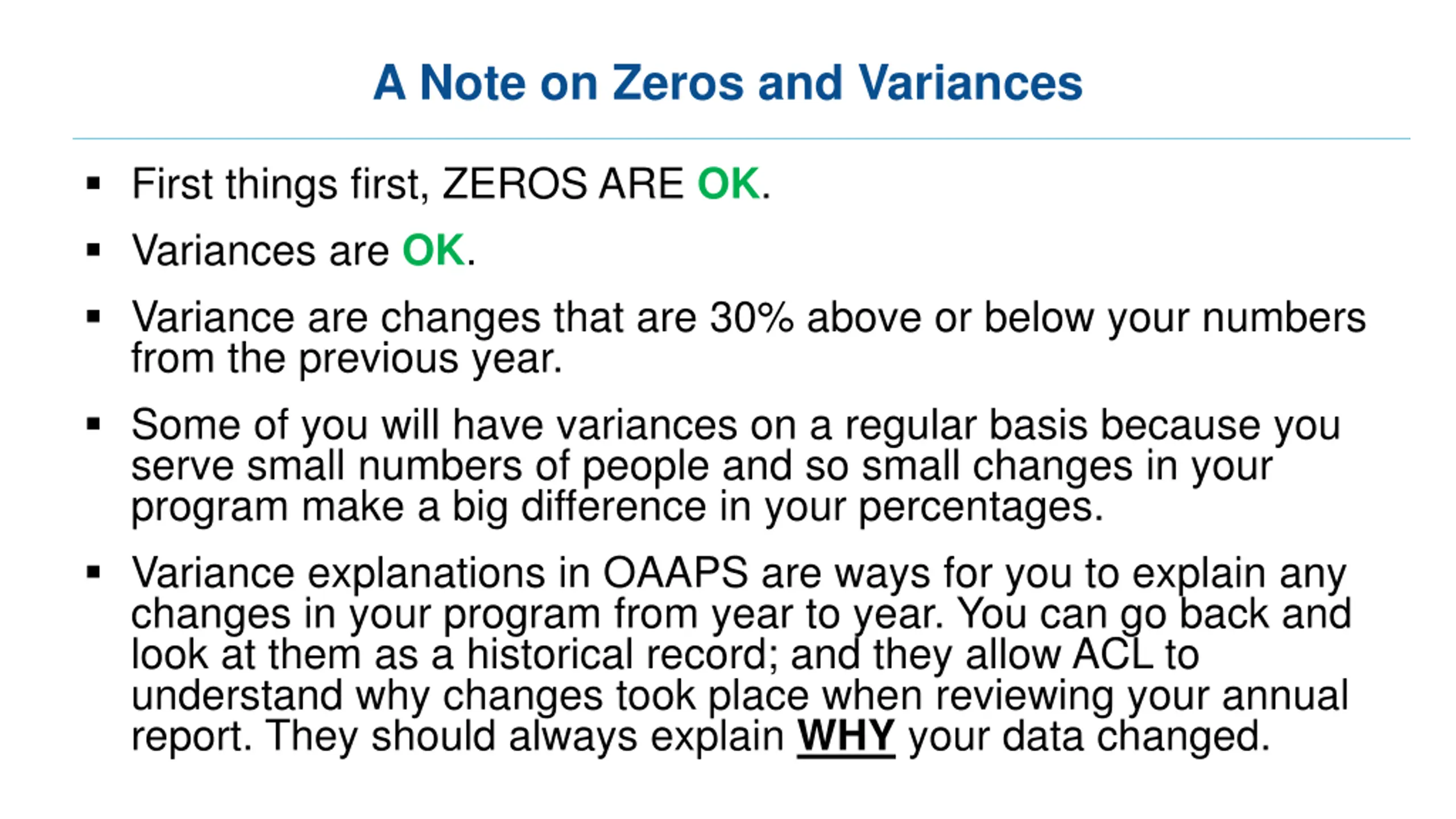 A Note on Zeros and Variances First things first, ZEROS ARE OK. Variances are OK. Variance are changes that are 30% above or below your numbers from the previous year. Some of you will have variances on a regular basis because you serve small numbers of people and so small changes in your program make a big difference in your percentages. Variance explanations in OAAPS are ways for you to explain any changes in your program from year to year. You can go back and look at them as a historical record; and they allow ACL to understand why changes took place when reviewing your annual report. They should always explain WHY your data changed.