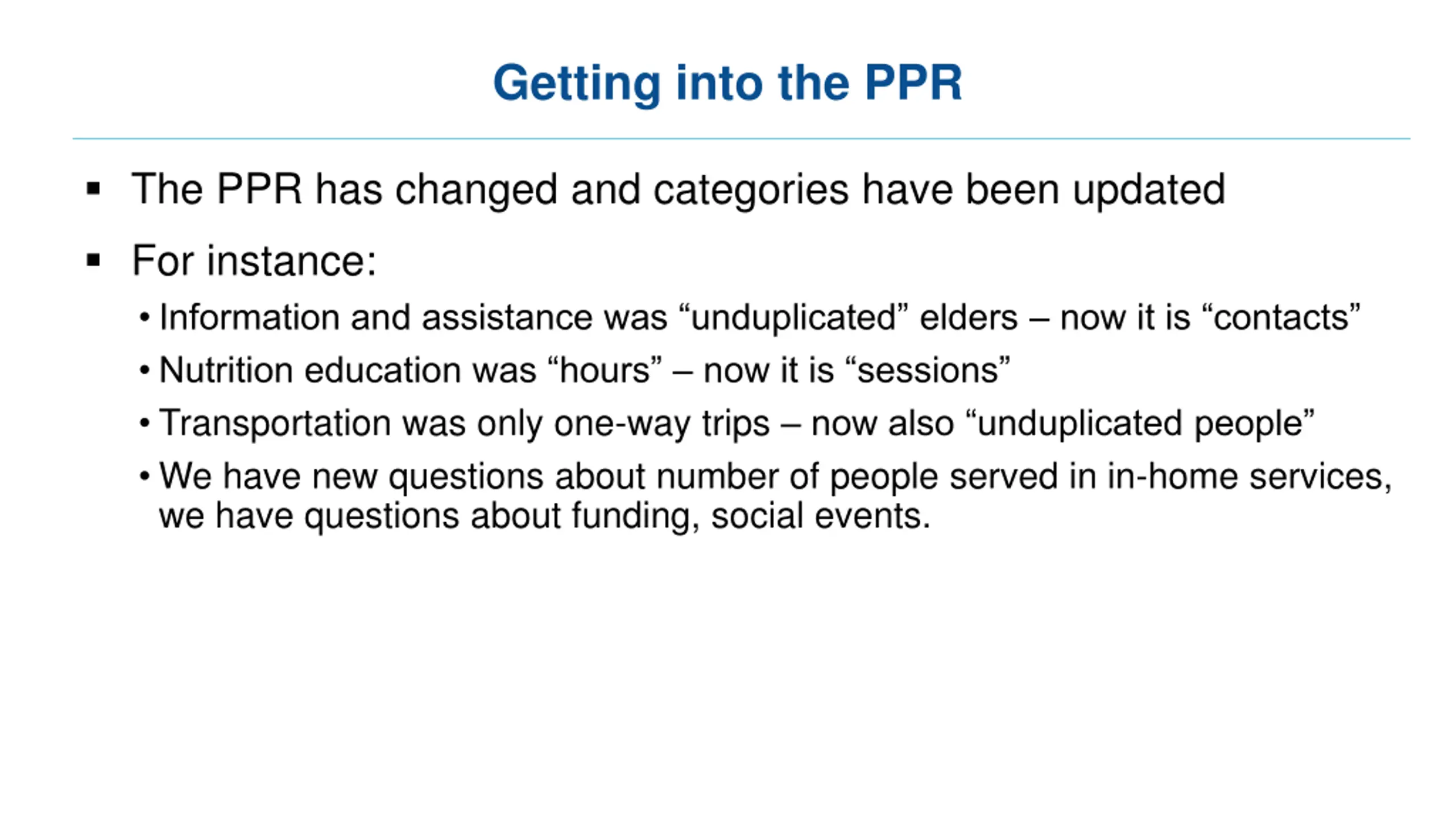 Getting into the PPR The PPR has changed and categories have been updated For instance: Information and assistance was unduplicated elders now it is contacts Nutrition education was hours now it is sessions Transportation was only one-way trips now also unduplicated people We have new questions about number of people served in in-home services, we have questions about funding, social events.