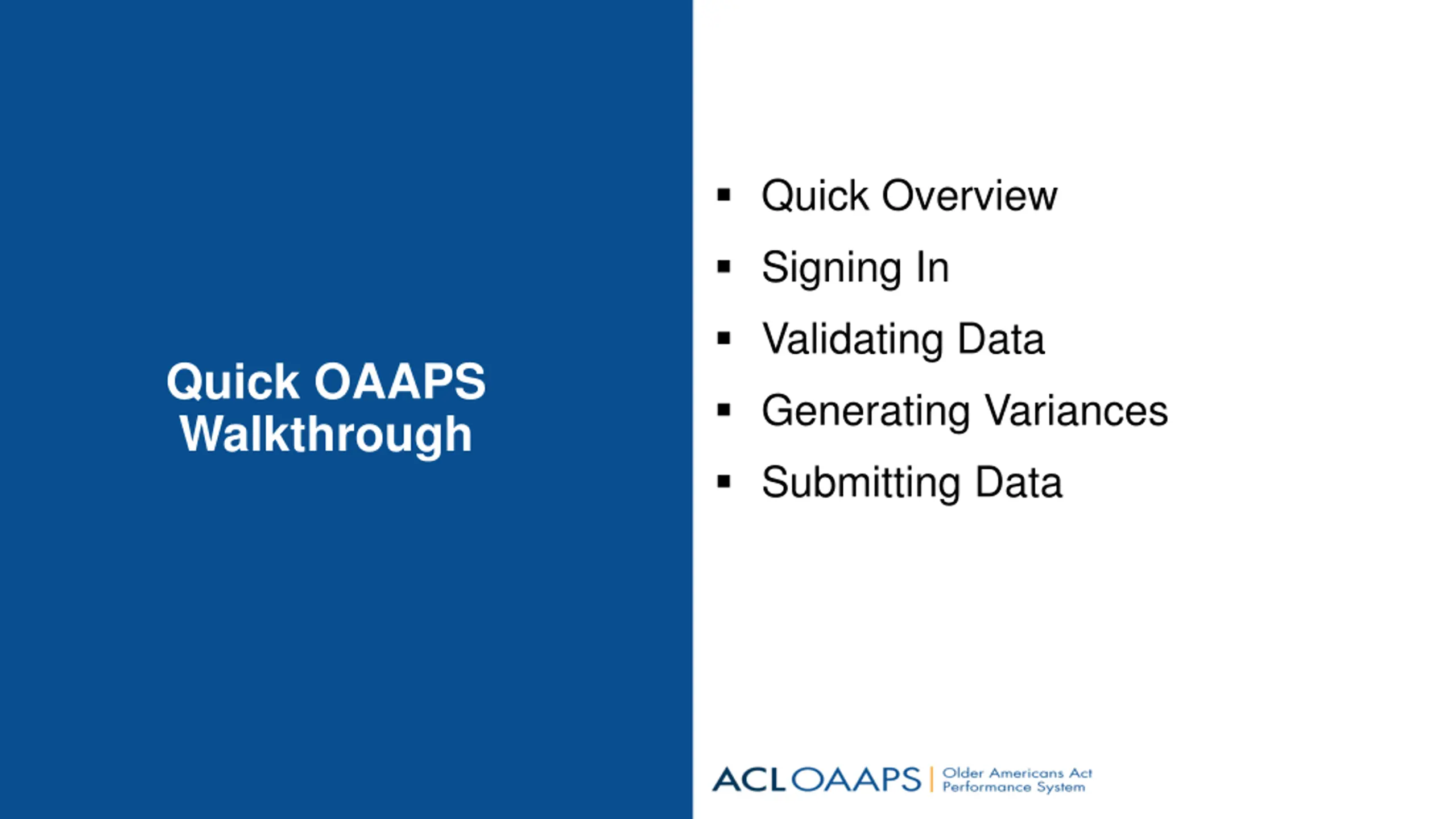 Quick Overview Signing In Validating Data Quick OAAPS Walkthrough Generating Variances Submitting Data