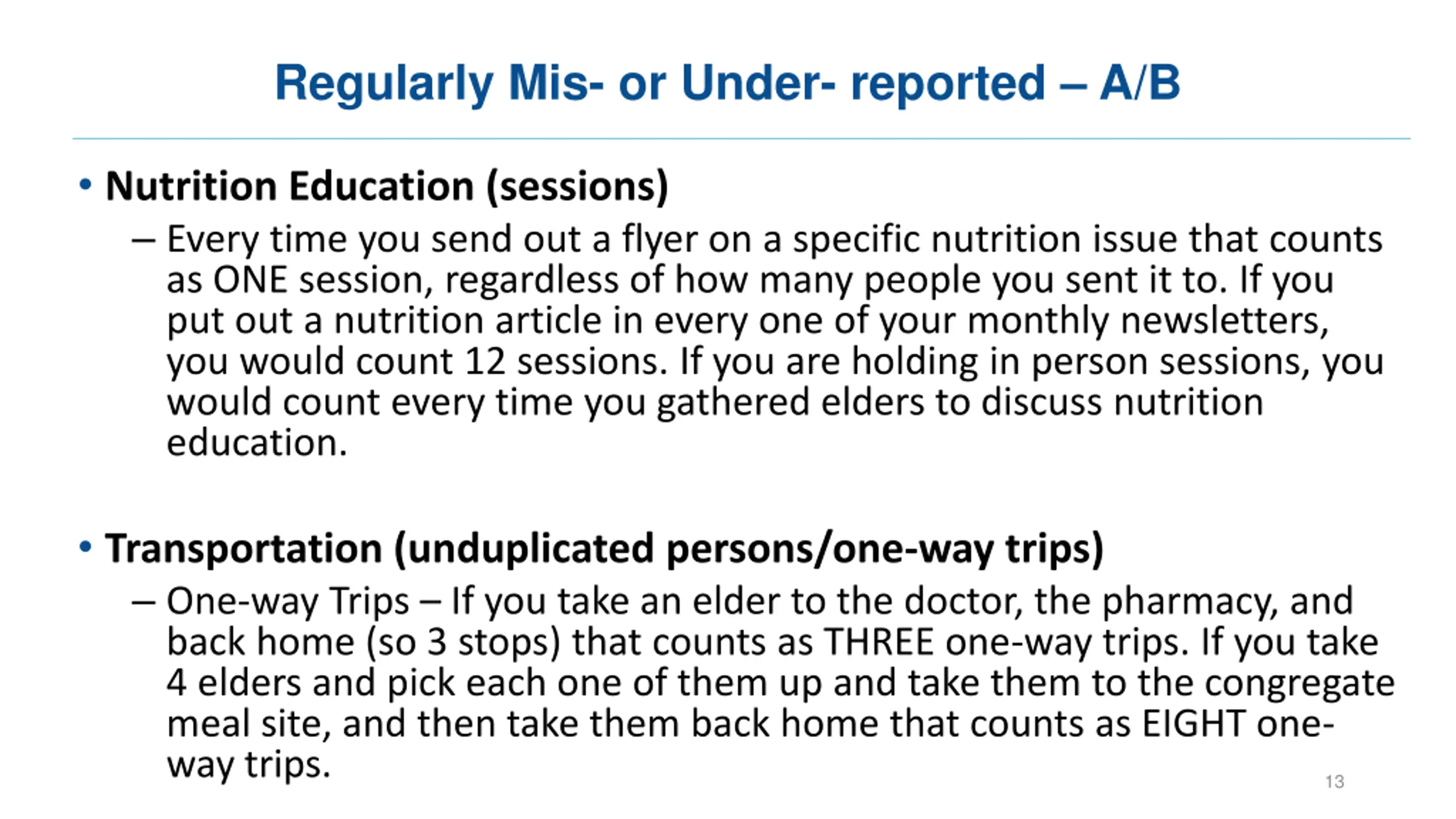 Regularly Mis- or Under- reported A/B Nutrition Education (sessions) Every time you send out a flyer on a specific nutrition issue that counts as ONE session, regardless of how many people you sent it to. If you put out a nutrition article in every one of your monthly newsletters, you would count 12 sessions. If you are holding in person sessions, you would count every time you gathered elders to discuss nutrition education. Transportation (unduplicated persons/one-way trips) One-way Trips If you take an elder to the doctor, the pharmacy, and back home (so 3 stops) that counts as THREE one-way trips. If you take 4 elders and pick each one of them up and take them to the congregate meal site, and then take them back home that counts as EIGHT one- way trips. 13