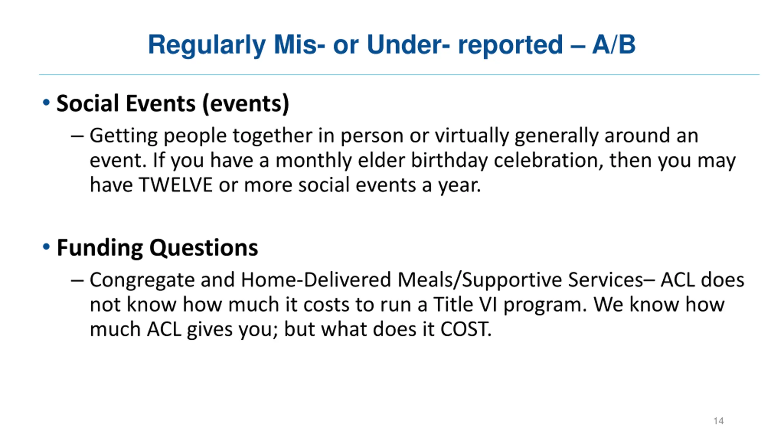 Regularly Mis- or Under- reported A/B Social Events (events) Getting people together in person or virtually generally around an event. If you have a monthly elder birthday celebration, then you may have TWELVE or more social events a year. Funding Questions Congregate and Home-Delivered Meals/Supportive Services ACL does not know how much it costs to run a Title VI program. We know how much ACL gives you; but what does it COST. 14