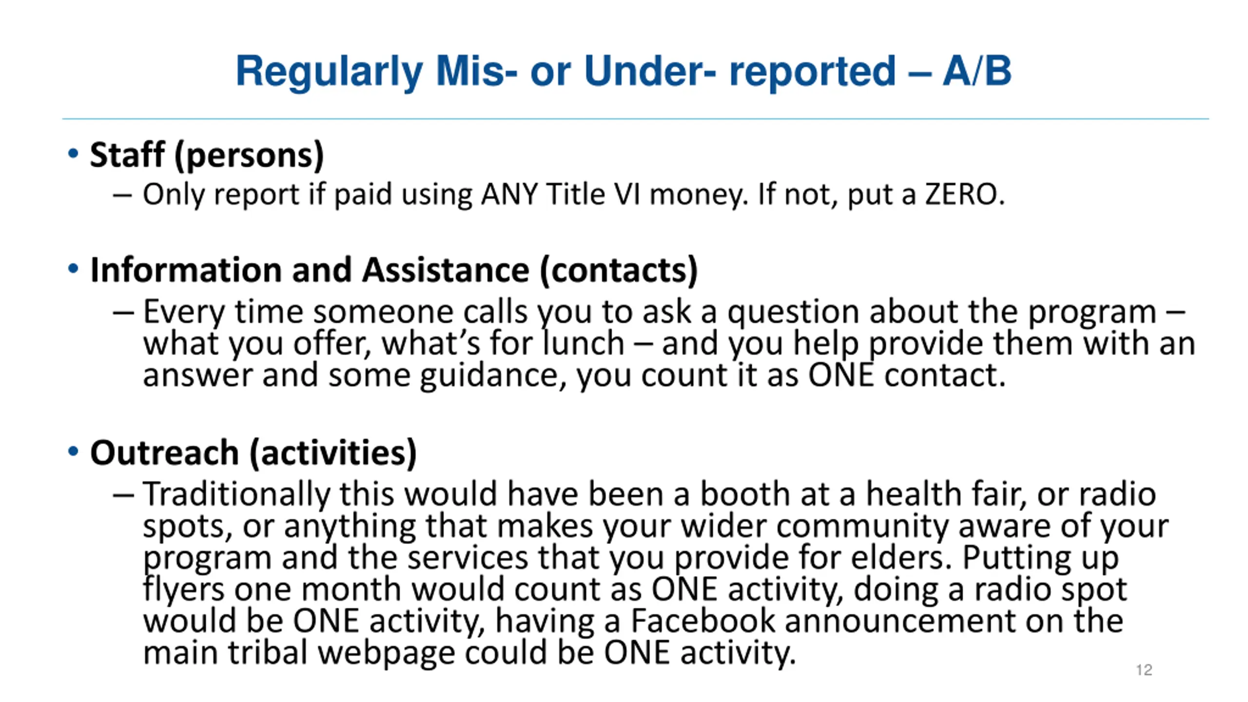 Regularly Mis- or Under- reported A/B Staff (persons) Only report if paid using ANY Title VI money. If not, put a ZERO. Information and Assistance (contacts) Every time someone calls you to ask a question about the program what you offer, what s for lunch and you help provide them with an answer and some guidance, you count it as ONE contact. Outreach (activities) Traditionally this would have been a booth at a health fair, or radio spots, or anything that makes your wider community aware of your program and the services that you provide for elders. Putting up flyers one month would count as ONE activity, doing a radio spot would be ONE activity, having a Facebook announcement on the main tribal webpage could be ONE activity. 12
