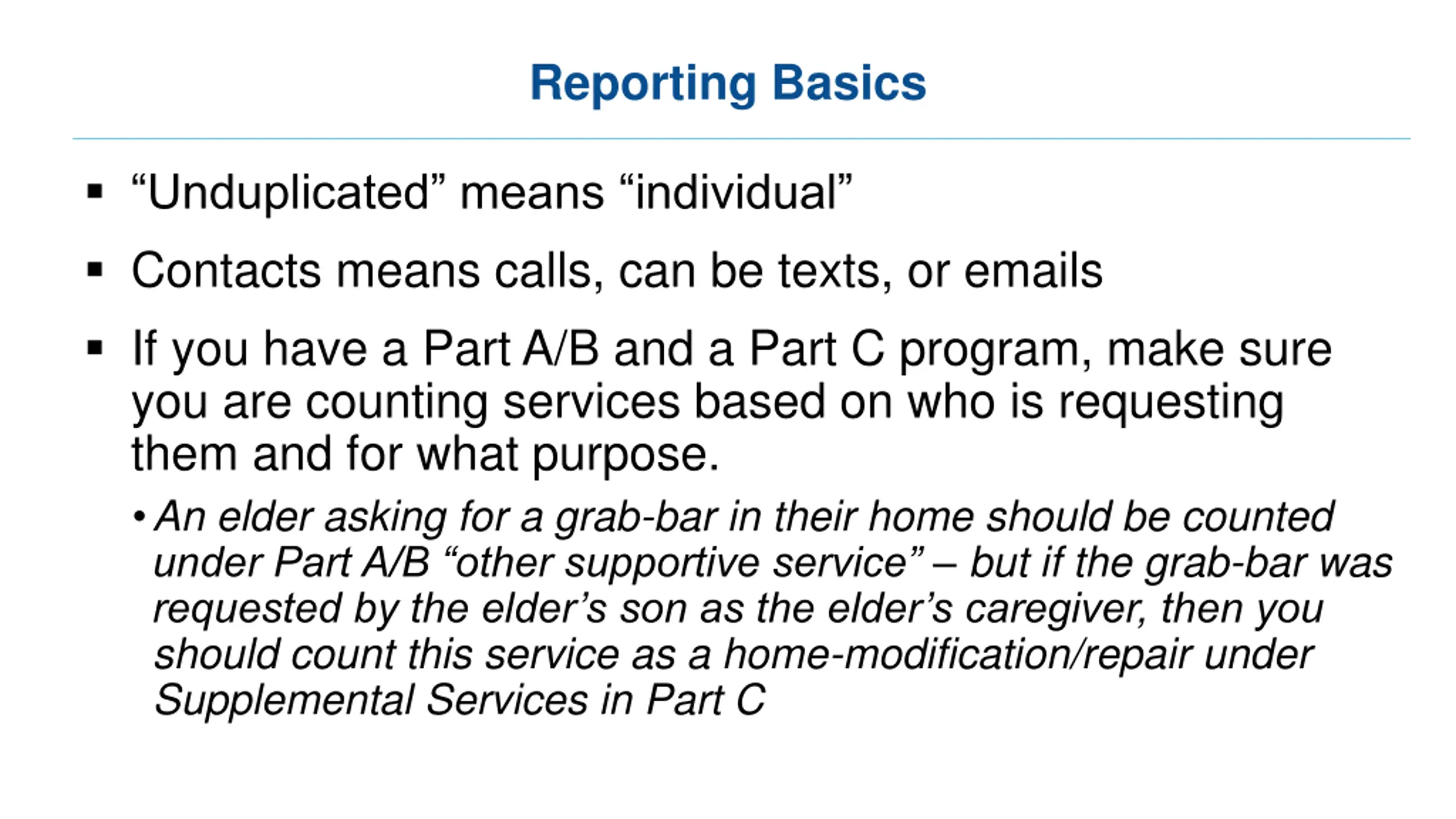 Reporting Basics Unduplicated means individual Contacts means calls, can be texts, or emails If you have a Part A/B and a Part C program, make sure you are counting services based on who is requesting them and for what purpose. An elder asking for a grab-bar in their home should be counted under Part A/B other supportive service but if the grab-bar was requested by the elder s son as the elder s caregiver, then you should count this service as a home-modification/repair under Supplemental Services in Part C