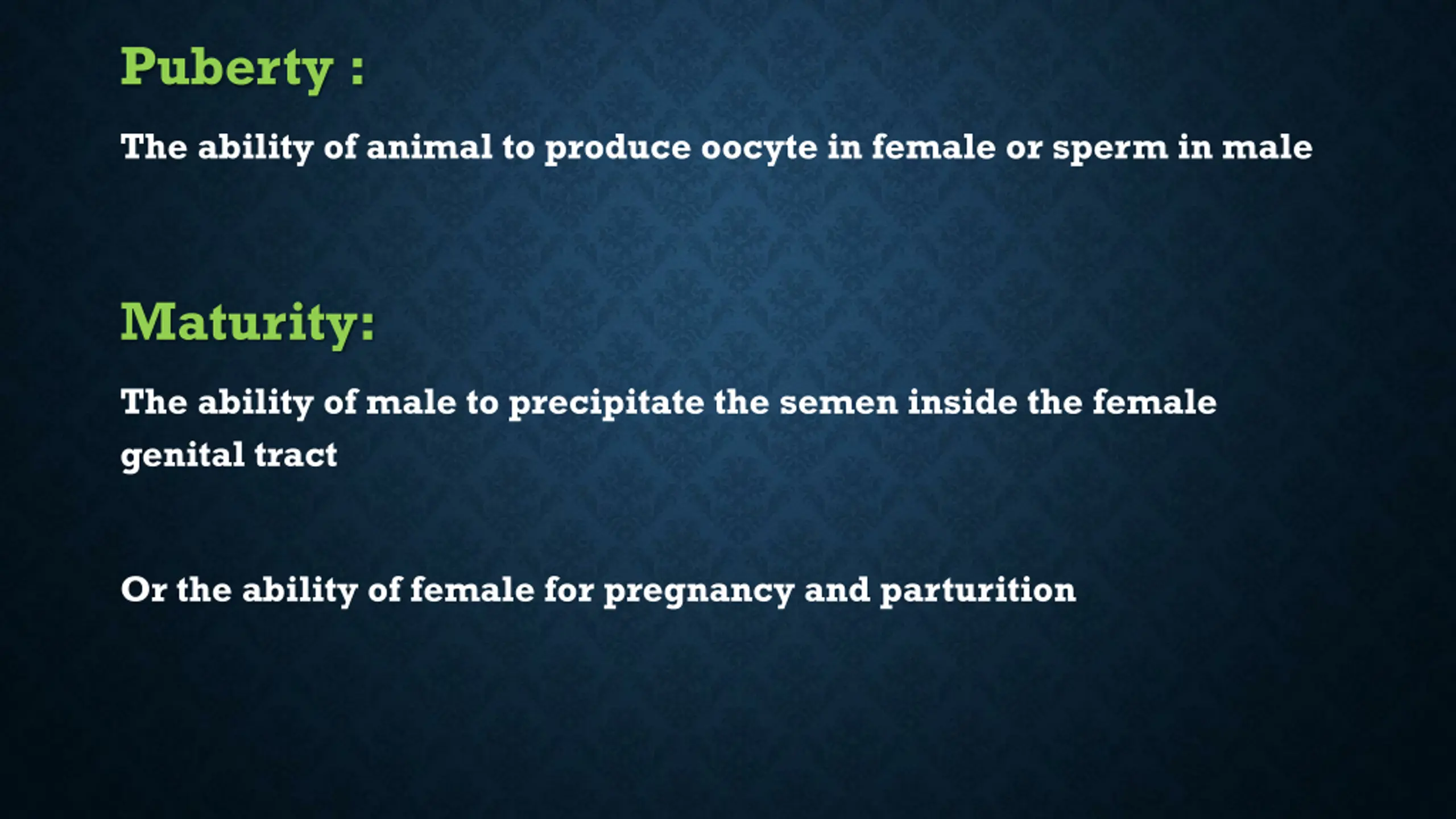 Puberty : The ability of animal to produce oocyte in female or sperm in male Maturity: The ability of male to precipitate the semen inside the female genital tract Or the ability of female for pregnancy and parturition