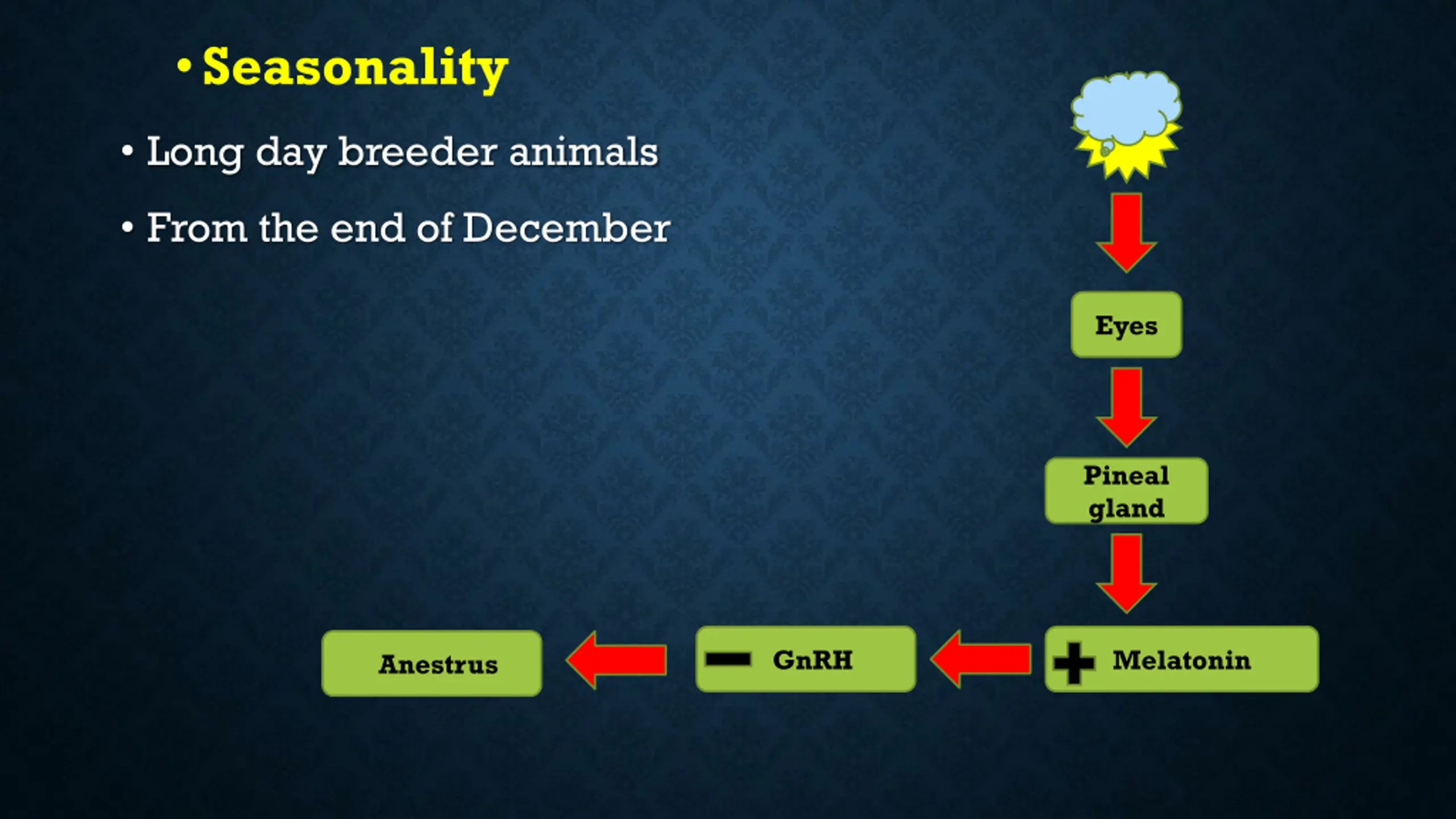 Seasonality Long day breeder animals From the end of December Eyes Pineal gland GnRH Melatonin Anestrus