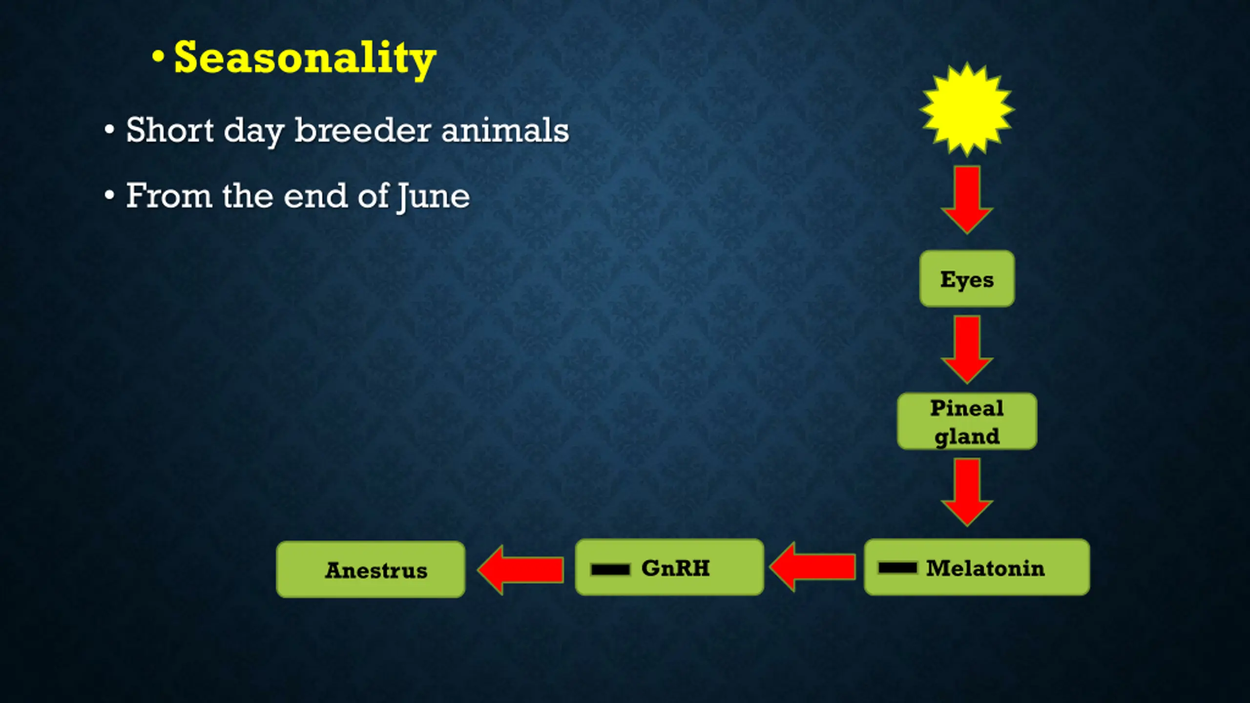 Seasonality Short day breeder animals From the end of June Eyes Pineal gland GnRH Melatonin Anestrus