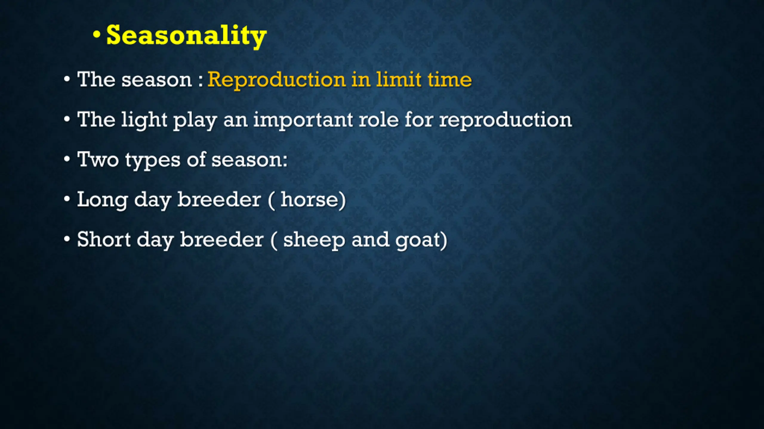 Seasonality The season : Reproduction in limit time The light play an important role for reproduction Two types of season: Long day breeder ( horse) Short day breeder ( sheep and goat)