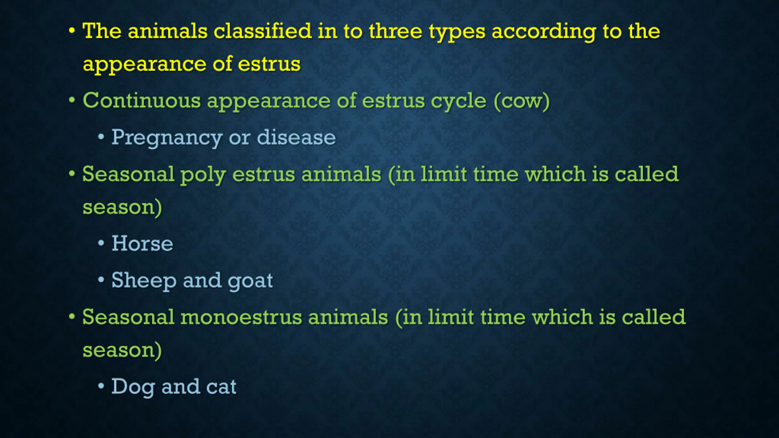 The animals classified in to three types according to the appearance of estrus Continuous appearance of estrus cycle (cow) Pregnancy or disease Seasonal poly estrus animals (in limit time which is called season) Horse Sheep and goat Seasonal monoestrus animals (in limit time which is called season) Dog and cat