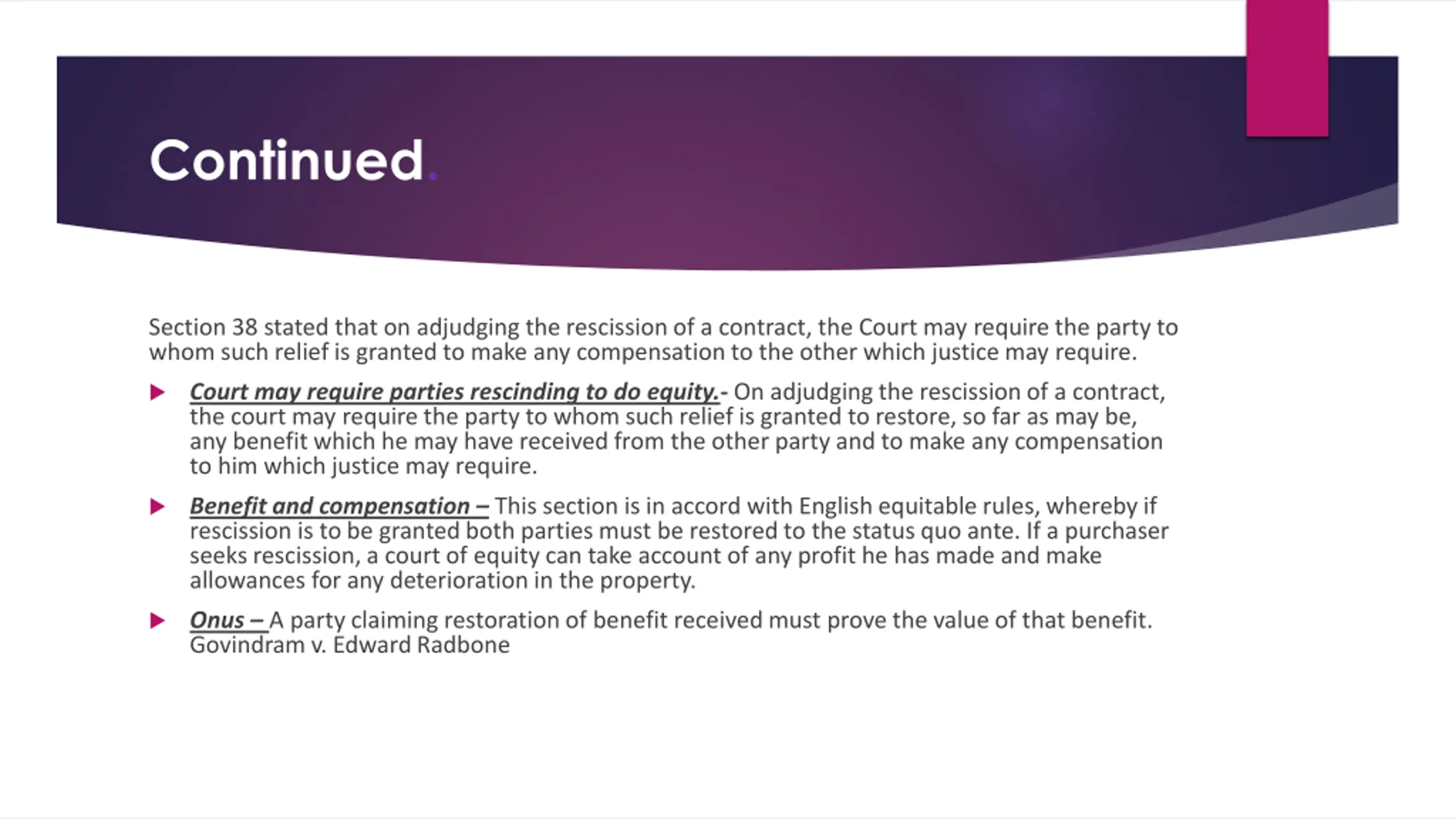 Continued. Section 38 stated that on adjudging the rescission of a contract, the Court may require the party to whom such relief is granted to make any compensation to the other which justice may require. Court may require parties rescinding to do equity.- On adjudging the rescission of a contract, the court may require the party to whom such relief is granted to restore, so far as may be, any benefit which he may have received from the other party and to make any compensation to him which justice may require. Benefit and compensation This section is in accord with English equitable rules, whereby if rescission is to be granted both parties must be restored to the status quo ante. If a purchaser seeks rescission, a court of equity can take account of any profit he has made and make allowances for any deterioration in the property. Onus A party claiming restoration of benefit received must prove the value of that benefit. Govindram v. Edward Radbone