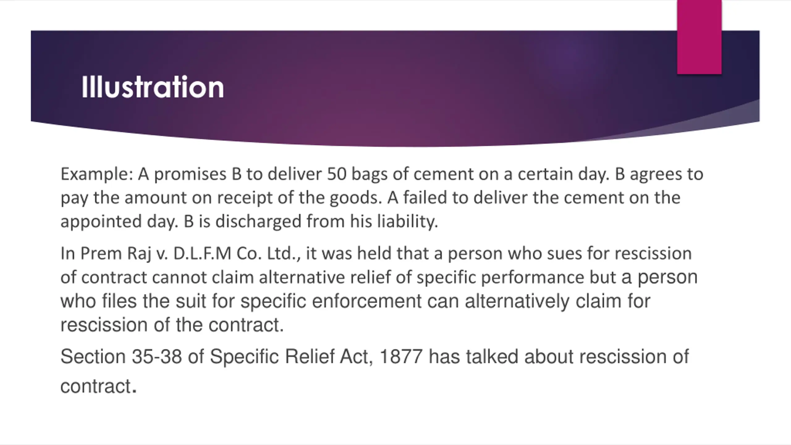 Illustration Example: A promises B to deliver 50 bags of cement on a certain day. B agrees to pay the amount on receipt of the goods. A failed to deliver the cement on the appointed day. B is discharged from his liability. In Prem Raj v. D.L.F.M Co. Ltd., it was held that a person who sues for rescission of contract cannot claim alternative relief of specific performance but a person who files the suit for specific enforcement can alternatively claim for rescission of the contract. Section 35-38 of Specific Relief Act, 1877 has talked about rescission of contract.