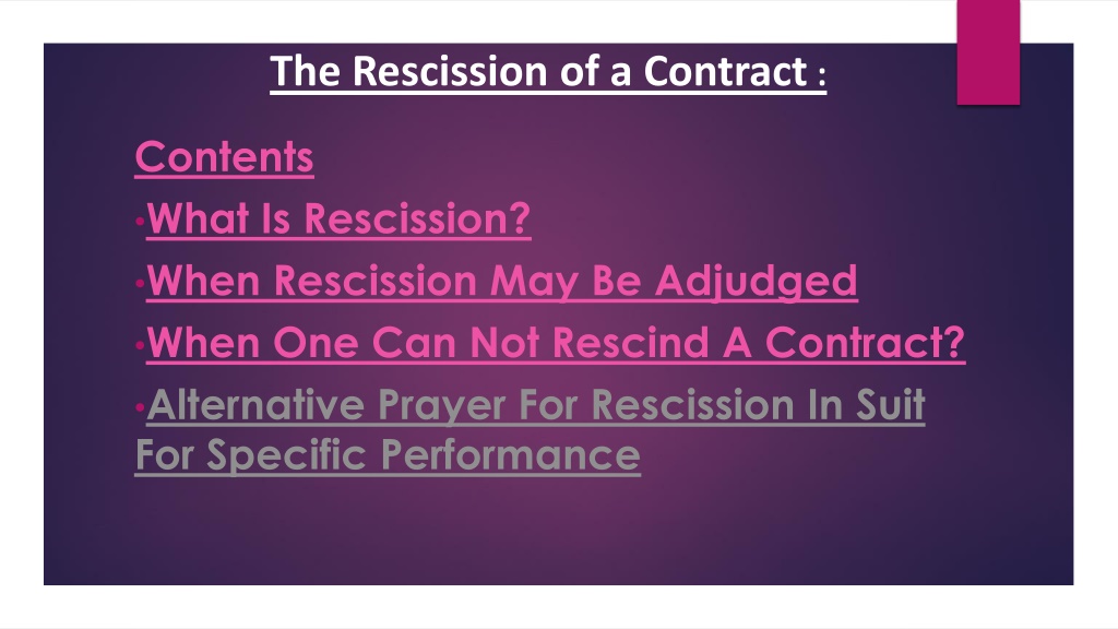 The Rescission of a Contract : Contents What Is Rescission? When Rescission May Be Adjudged When One Can Not Rescind A Contract? Alternative Prayer For Rescission In Suit For Specific Performance