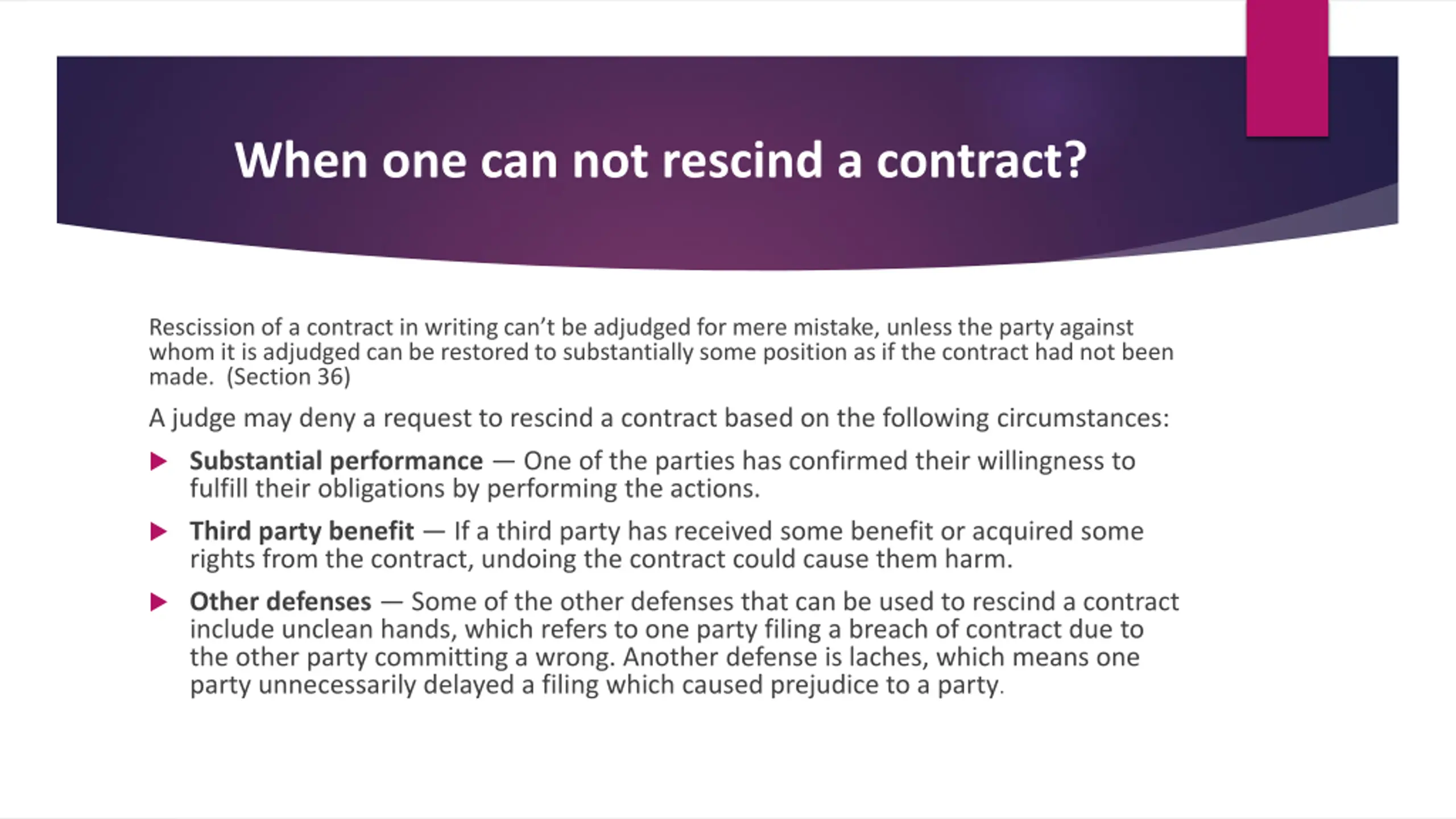 When one can not rescind a contract? Rescission of a contract in writing can t be adjudged for mere mistake, unless the party against whom it is adjudged can be restored to substantially some position as if the contract had not been made. (Section 36) A judge may deny a request to rescind a contract based on the following circumstances: Substantial performance One of the parties has confirmed their willingness to fulfill their obligations by performing the actions. Third party benefit If a third party has received some benefit or acquired some rights from the contract, undoing the contract could cause them harm. Other defenses Some of the other defenses that can be used to rescind a contract include unclean hands, which refers to one party filing a breach of contract due to the other party committing a wrong. Another defense is laches, which means one party unnecessarily delayed a filing which caused prejudice to a party.
