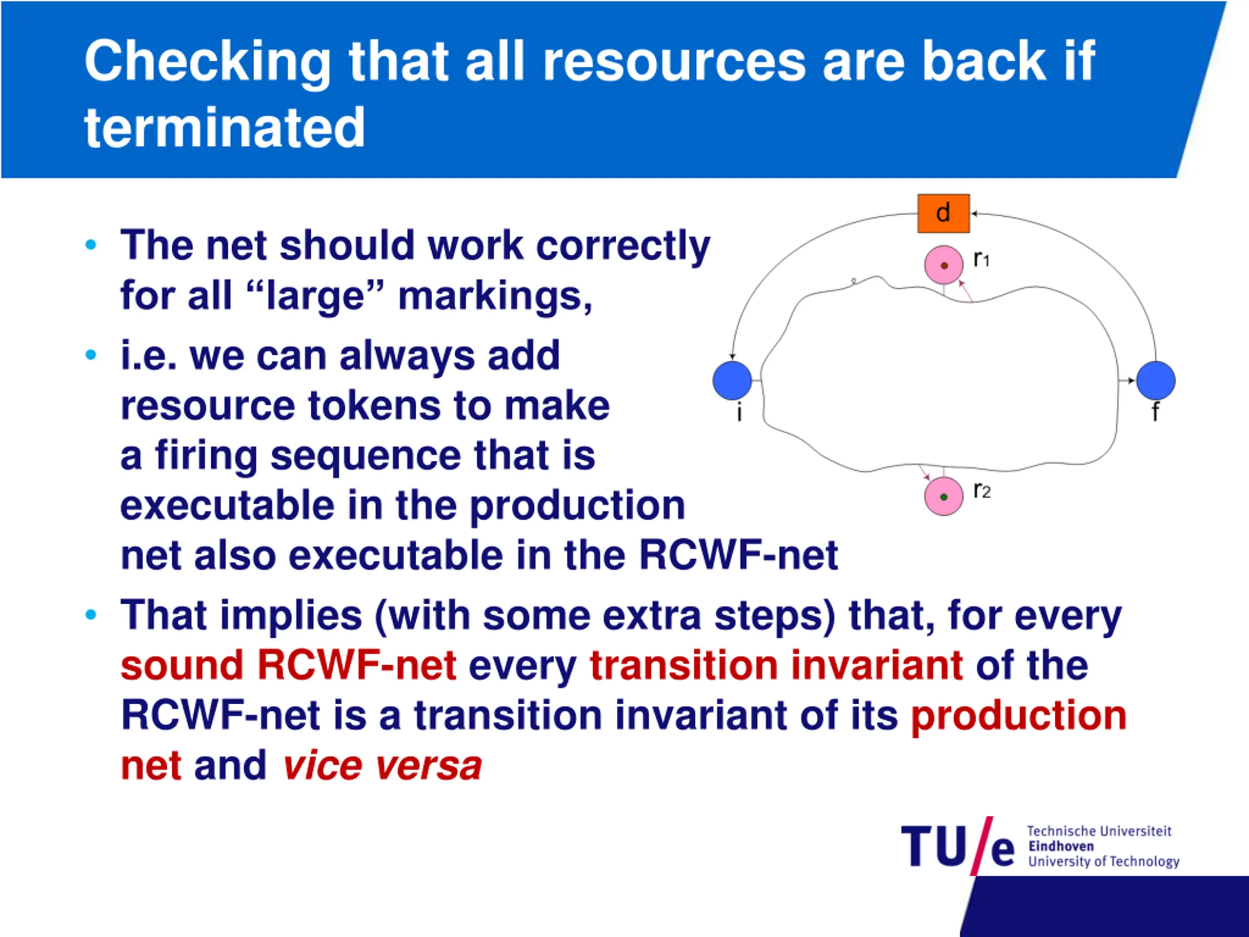 Checking that all resources are back if terminated The net should work correctly for all large markings, i.e. we can always add resource tokens to make a firing sequence that is executable in the production net also executable in the RCWF-net That implies (with some extra steps) that, for every sound RCWF-net every transition invariant of the RCWF-net is a transition invariant of its production net and vice versa