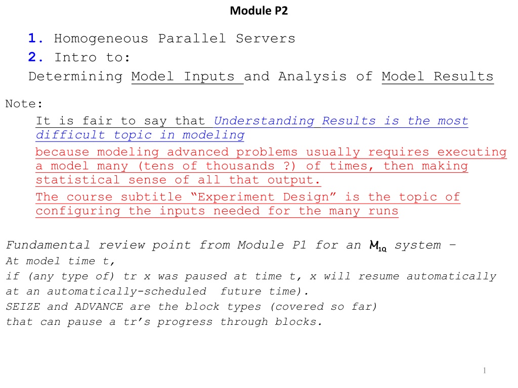 Module P2 1. Homogeneous Parallel Servers 2. Intro to: Determining Model Inputs and Analysis of Model Results Note: It is fair to say that Understanding Results is the most difficult topic in modeling because modeling advanced problems usually requires executing a model many (tens of thousands ?) of times, then making statistical sense of all that output. The course subtitle Experiment Design is the topic of configuring the inputs needed for the many runs Fundamental review point from Module P1 for an M At model time t, if (any type of) tr x was paused at time t, x will resume automatically at an automatically-scheduled future time). SEIZE and ADVANCE are the block types (covered so far) that can pause a tr s progress through blocks. M1Qsystem 1