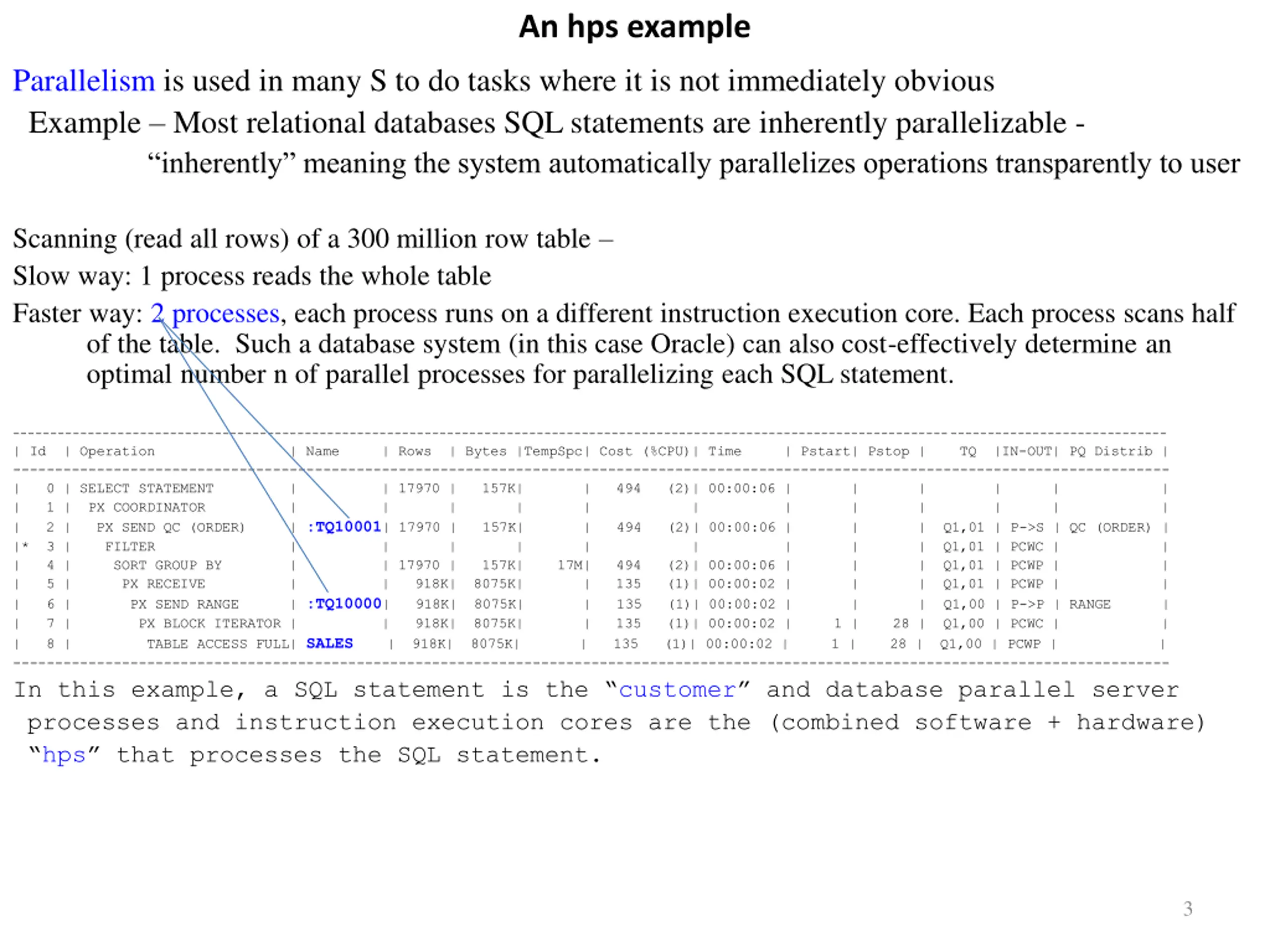 An hps example Parallelism is used in many S to do tasks where it is not immediately obvious Example Most relational databases SQL statements are inherently parallelizable - inherently meaning the system automatically parallelizes operations transparently to user Scanning (read all rows) of a 300 million row table Slow way: 1 process reads the whole table Faster way: 2 processes, each process runs on a different instruction execution core. Each process scans half of the table. Such a database system (in this case Oracle) can also cost-effectively determine an optimal number n of parallel processes for parallelizing each SQL statement. ---------------------------------------------------------------------------------------------------------------------------------------------------------- | Id | Operation | Name | Rows | Bytes |TempSpc| Cost (%CPU)| Time | Pstart| Pstop | TQ |IN-OUT| PQ Distrib | ------------------------------------------------------------------------------------------------------------------------------------------ | 0 | SELECT STATEMENT | | 17970 | 157K| | 494 (2)| 00:00:06 | | | | | | 1 | PX COORDINATOR | | | | | | | | | | | | 2 | PX SEND QC (ORDER) | :TQ10001| 17970 | 157K| | 494 (2)| 00:00:06 | | | Q1,01 | P->S | QC (ORDER) | |* 3 | FILTER | | | | | | | | | Q1,01 | PCWC | | 4 | SORT GROUP BY | | 17970 | 157K| 17M| 494 (2)| 00:00:06 | | | Q1,01 | PCWP | | 5 | PX RECEIVE | | 918K| 8075K| | 135 (1)| 00:00:02 | | | Q1,01 | PCWP | | 6 | PX SEND RANGE | :TQ10000| 918K| 8075K| | 135 (1)| 00:00:02 | | | Q1,00 | P->P | RANGE | | 7 | PX BLOCK ITERATOR | | 918K| 8075K| | 135 (1)| 00:00:02 | 1 | 28 | Q1,00 | PCWC | | 8 | TABLE ACCESS FULL| SALES | 918K| 8075K| | 135 (1)| 00:00:02 | 1 | 28 | Q1,00 | PCWP | | ------------------------------------------------------------------------------------------------------------------------------------------ In this example, a SQL statement is the customer and database parallel server processes and instruction execution cores are the (combined software + hardware) hps that processes the SQL statement. | | | | | | 3