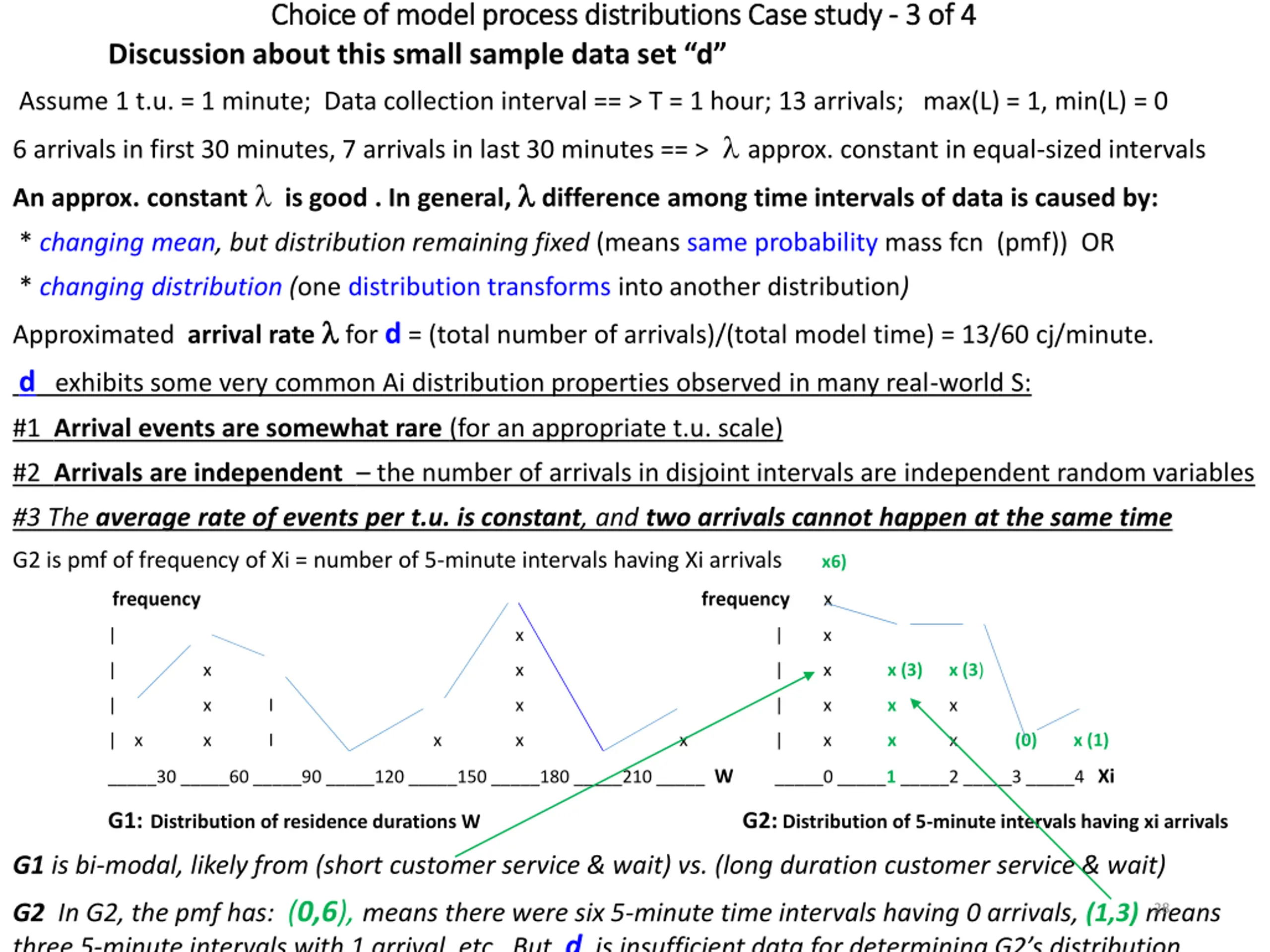 Choice of model process distributions Case study Choice of model process distributions Case study - - 3 of 4 Discussion about this small sample data set d 3 of 4 Assume 1 t.u. = 1 minute; Data collection interval == > T = 1 hour; 13 arrivals; max(L) = 1, min(L) = 0 6 arrivals in first 30 minutes, 7 arrivals in last 30 minutes == > approx. constant in equal-sized intervals An approx. constant is good . In general, difference among time intervals of data is caused by: * changing mean, but distribution remaining fixed (means same probability mass fcn (pmf)) OR * changing distribution (one distribution transforms into another distribution) Approximated arrival rate for d = (total number of arrivals)/(total model time) = 13/60 cj/minute. d exhibits some very common Ai distribution properties observed in many real-world S: #1 Arrival events are somewhat rare (for an appropriate t.u. scale) #2 Arrivals are independent the number of arrivals in disjoint intervals are independent random variables #3 The average rate of events per t.u. is constant, and two arrivals cannot happen at the same time G2 is pmf of frequency of Xi = number of 5-minute intervals having Xi arrivalsx6) frequency frequency x | x | x | x x | x x (3)x (3) | x I x | x x x | x x I x x x | x x x (0) x (1) _____30 _____60 _____90 _____120 _____150 _____180 _____210 _____ W _____0 _____1 _____2 _____3 _____4 Xi G1:Distribution of residence durations W G2: Distribution of 5-minute intervals having xi arrivals G1 is bi-modal, likely from (short customer service & wait) vs. (long duration customer service & wait) G2 In G2, the pmf has: (0,6), means there were six 5-minute time intervals having 0 arrivals, (1,3) means three 5-minute intervals with 1 arrival, etc. But d is insufficient data for determining G2 s distribution. 28