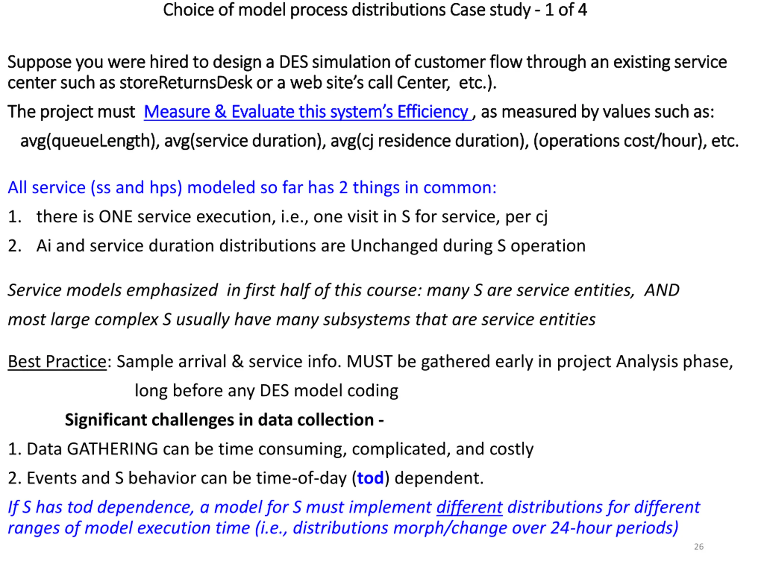 Choice of model process distributions Case study Choice of model process distributions Case study - - 1 of 4 1 of 4 Suppose you were hired to design a DES simulation of customer flow through an existing service Suppose you were hired to design a DES simulation of customer flow through an existing service center such as storeReturnsDesk or a web site s call Center, etc.). center such as storeReturnsDesk or a web site s call Center, etc.). The project must The project must Measure & Evaluate this system s Efficiency Measure & Evaluate this system s Efficiency , as measured by values such as: , as measured by values such as: avg(queueLength), avg(service duration), avg(cj residence duration), (operations cost/hour), etc. avg(queueLength), avg(service duration), avg(cj residence duration), (operations cost/hour), etc. All service (ss and hps) modeled so far has 2 things in common: 1. there is ONE service execution, i.e., one visit in S for service, per cj 2. Ai and service duration distributions are Unchanged during S operation Service models emphasized in first half of this course: many S are service entities, AND most large complex S usually have many subsystems that are service entities Best Practice: Sample arrival & service info. MUST be gathered early in project Analysis phase, long before any DES model coding Significant challenges in data collection - 1. Data GATHERING can be time consuming, complicated, and costly 2. Events and S behavior can be time-of-day (tod) dependent. If S has tod dependence, a model for S must implement different distributions for different ranges of model execution time (i.e., distributions morph/change over 24-hour periods) 26