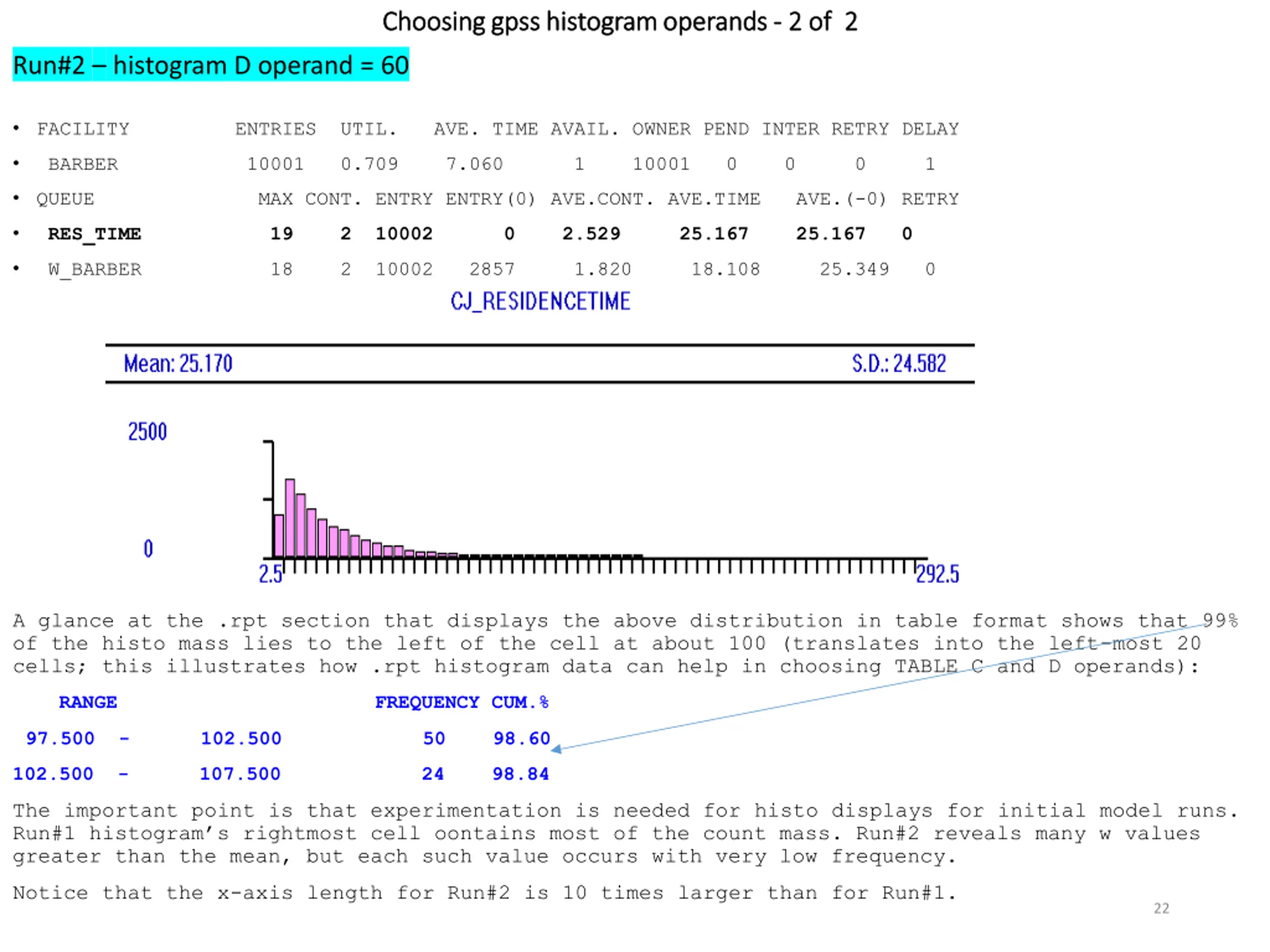 Choosing gpss histogram operands Choosing gpss histogram operands - - 2 of 2 2 of 2 Run#2 histogram D operand = 60 FACILITY ENTRIES UTIL. AVE. TIME AVAIL. OWNER PEND INTER RETRY DELAY BARBER 10001 0.709 7.060 1 10001 0 0 0 1 QUEUE MAX CONT. ENTRY ENTRY(0) AVE.CONT. AVE.TIME AVE.(-0) RETRY RES_TIME 19 2 10002 0 2.529 25.167 25.167 0 W_BARBER 18 2 10002 2857 1.820 18.108 25.349 0 A glance at the .rpt section that displays the above distribution in table format shows that 99% of the histo mass lies to the left of the cell at about 100 (translates into the left-most 20 cells; this illustrates how .rpt histogram data can help in choosing TABLE C and D operands): RANGE FREQUENCY CUM.% 97.500 - 102.500 50 98.60 102.500 - 107.500 24 98.84 The important point is that experimentation is needed for histo displays for initial model runs. Run#1 histogram s rightmost cell oontains most of the count mass. Run#2 reveals many w values greater than the mean, but each such value occurs with very low frequency. Notice that the x-axis length for Run#2 is 10 times larger than for Run#1. 22