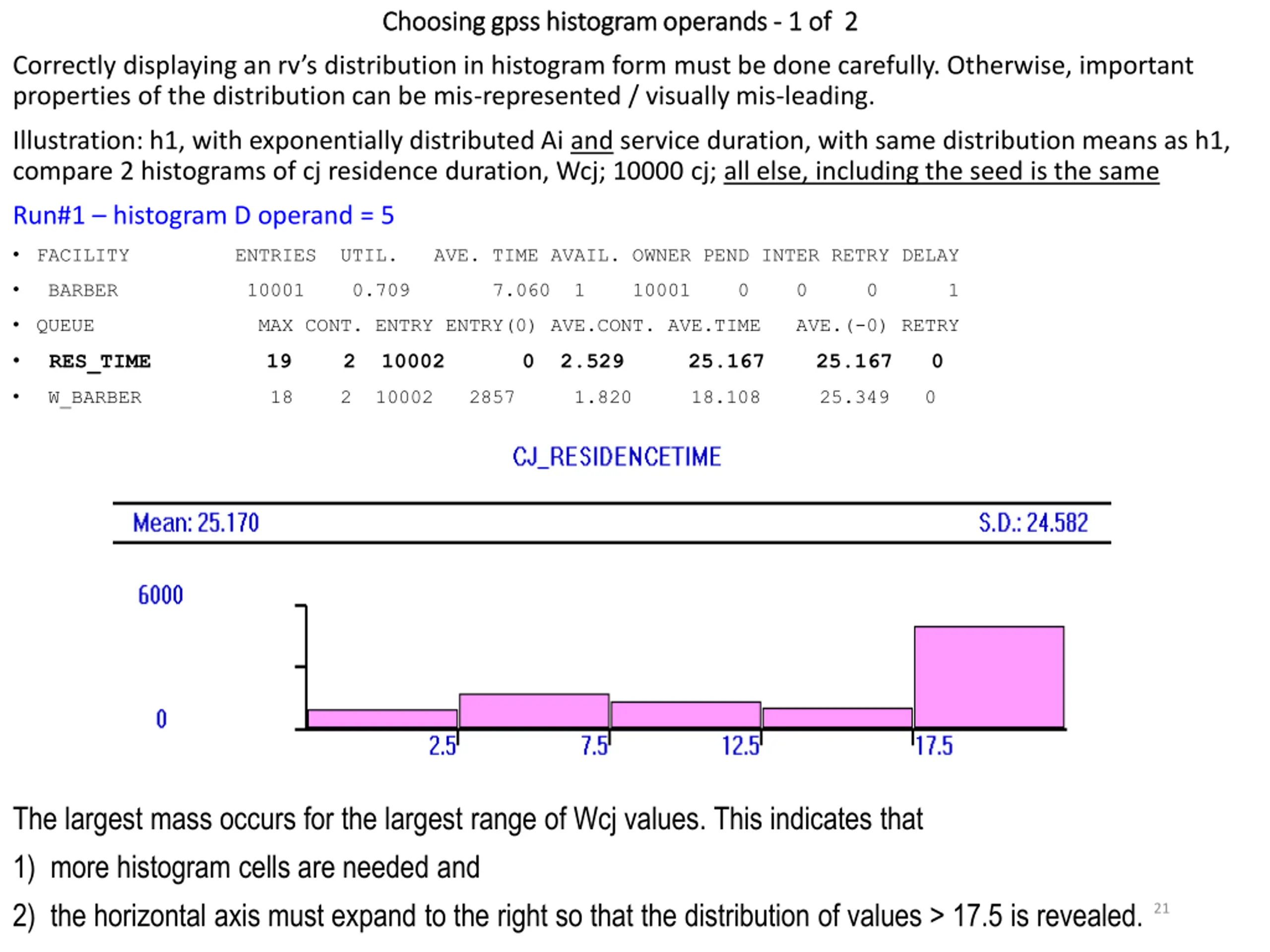 Choosing gpss histogram operands Choosing gpss histogram operands - - 1 of 2 1 of 2 Correctly displaying an rv s distribution in histogram form must be done carefully. Otherwise, important properties of the distribution can be mis-represented / visually mis-leading. Illustration: h1, with exponentially distributed Ai and service duration, with same distribution means as h1, compare 2 histograms of cj residence duration, Wcj; 10000 cj; all else, including the seed is the same Run#1 histogram D operand = 5 FACILITY ENTRIES UTIL. AVE. TIME AVAIL. OWNER PEND INTER RETRY DELAY BARBER 10001 0.709 7.060 1 10001 0 0 0 1 QUEUE MAX CONT. ENTRY ENTRY(0) AVE.CONT. AVE.TIME AVE.(-0) RETRY RES_TIME 19 2 10002 0 2.529 25.167 25.167 0 W_BARBER 18 2 10002 2857 1.820 18.108 25.349 0 The largest mass occurs for the largest range of Wcj values. This indicates that 1) more histogram cells are needed and 2) the horizontal axis must expand to the right so that the distribution of values > 17.5 is revealed. 21