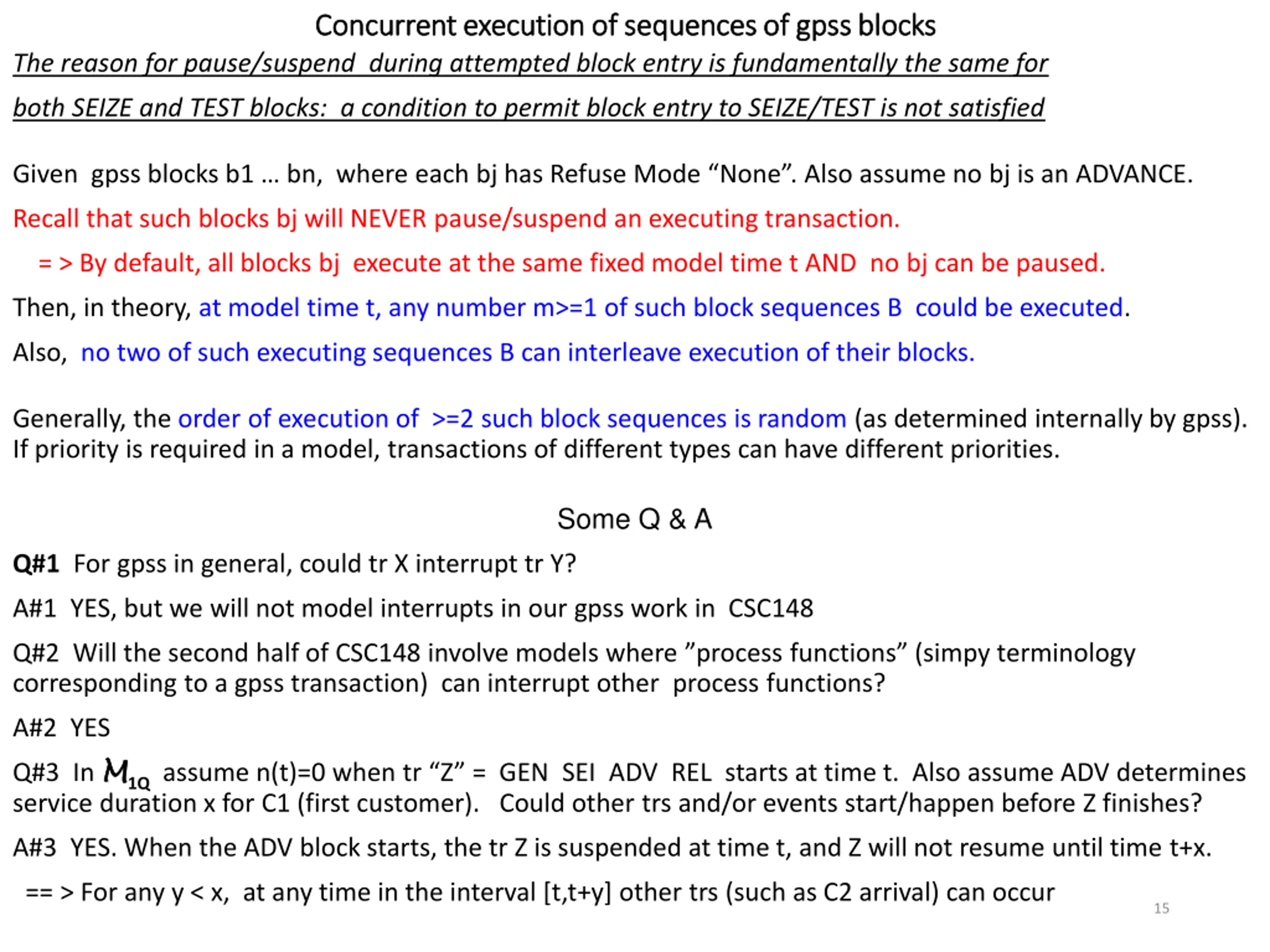 Concurrent execution of sequences of gpss blocks Concurrent execution of sequences of gpss blocks The reason for pause/suspend during attempted block entry is fundamentally the same for both SEIZE and TEST blocks: a condition to permit block entry to SEIZE/TEST is not satisfied Given gpss blocks b1 bn, where each bj has Refuse Mode None . Also assume no bj is an ADVANCE. Recall that such blocks bj will NEVER pause/suspend an executing transaction. = > By default, all blocks bj execute at the same fixed model time t AND no bj can be paused. Then, in theory, at model time t, any number m>=1 of such block sequences B could be executed. Also, no two of such executing sequences B can interleave execution of their blocks. Generally, the order of execution of >=2 such block sequences is random (as determined internally by gpss). If priority is required in a model, transactions of different types can have different priorities. Some Q & A Q#1 For gpss in general, could tr X interrupt tr Y? A#1 YES, but we will not model interrupts in our gpss work in CSC148 Q#2 Will the second half of CSC148 involve models where process functions (simpy terminology corresponding to a gpss transaction) can interrupt other process functions? A#2 YES Q#3 In M service duration x for C1 (first customer). Could other trs and/or events start/happen before Z finishes? M1Qassume n(t)=0 when tr Z = GEN SEI ADV REL starts at time t. Also assume ADV determines A#3 YES. When the ADV block starts, the tr Z is suspended at time t, and Z will not resume until time t+x. == > For any y < x, at any time in the interval [t,t+y] other trs (such as C2 arrival) can occur 15