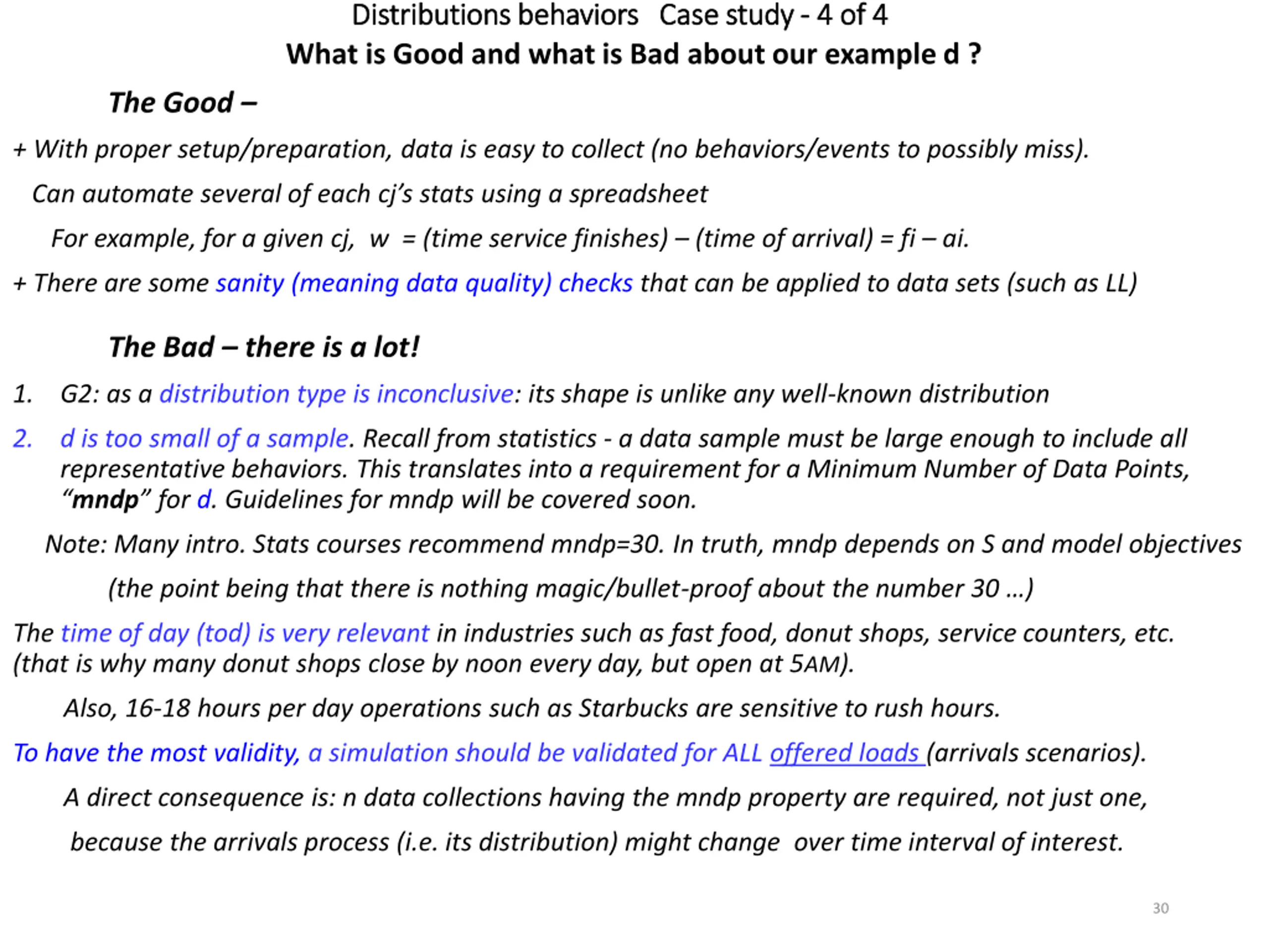 Distributions behaviors Case study Distributions behaviors Case study - - 4 of 4 What is Good and what is Bad about our example d ? 4 of 4 The Good + With proper setup/preparation, data is easy to collect (no behaviors/events to possibly miss). Can automate several of each cj s stats using a spreadsheet For example, for a given cj, w = (time service finishes) (time of arrival) = fi ai. + There are some sanity (meaning data quality) checks that can be applied to data sets (such as LL) The Bad there is a lot! 1. G2: as a distribution type is inconclusive: its shape is unlike any well-known distribution 2. d is too small of a sample. Recall from statistics - a data sample must be large enough to include all representative behaviors. This translates into a requirement for a Minimum Number of Data Points, mndp for d. Guidelines for mndp will be covered soon. Note: Many intro. Stats courses recommend mndp=30. In truth, mndp depends on S and model objectives (the point being that there is nothing magic/bullet-proof about the number 30 ) The time of day (tod) is very relevant in industries such as fast food, donut shops, service counters, etc. (that is why many donut shops close by noon every day, but open at 5AM). Also, 16-18 hours per day operations such as Starbucks are sensitive to rush hours. To have the most validity, a simulation should be validated for ALL offered loads (arrivals scenarios). A direct consequence is: n data collections having the mndp property are required, not just one, because the arrivals process (i.e. its distribution) might change over time interval of interest. 30