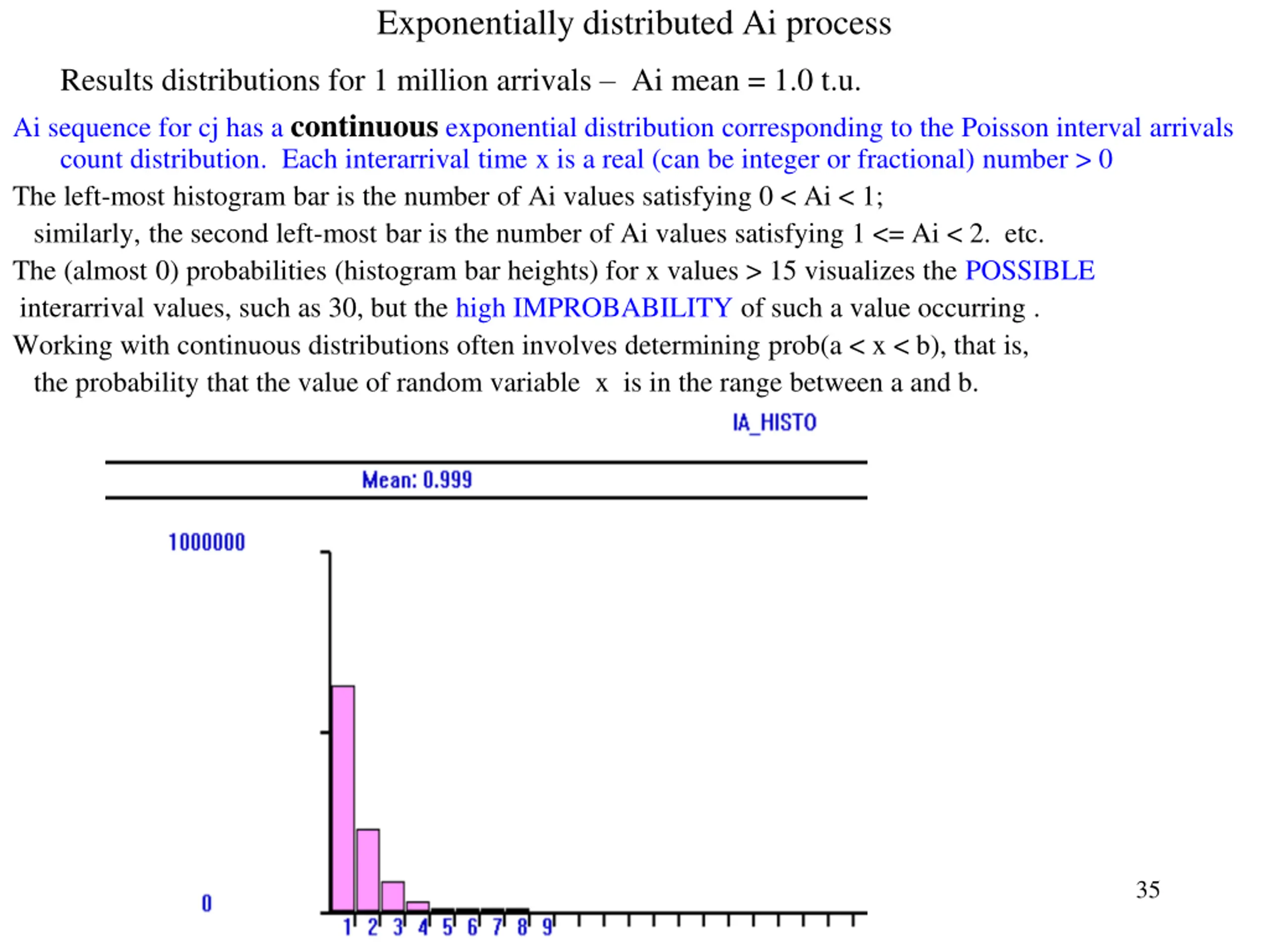 Exponentially distributed Ai process Results distributions for 1 million arrivals Ai mean = 1.0 t.u. Ai sequence for cj has a continuous exponential distribution corresponding to the Poisson interval arrivals count distribution. Each interarrival time x is a real (can be integer or fractional) number > 0 The left-most histogram bar is the number of Ai values satisfying 0 < Ai < 1; similarly, the second left-most bar is the number of Ai values satisfying 1 <= Ai < 2. etc. The (almost 0) probabilities (histogram bar heights) for x values > 15 visualizes the POSSIBLE interarrival values, such as 30, but the high IMPROBABILITY of such a value occurring . Working with continuous distributions often involves determining prob(a < x < b), that is, the probability that the value of random variable x is in the range between a and b. 35