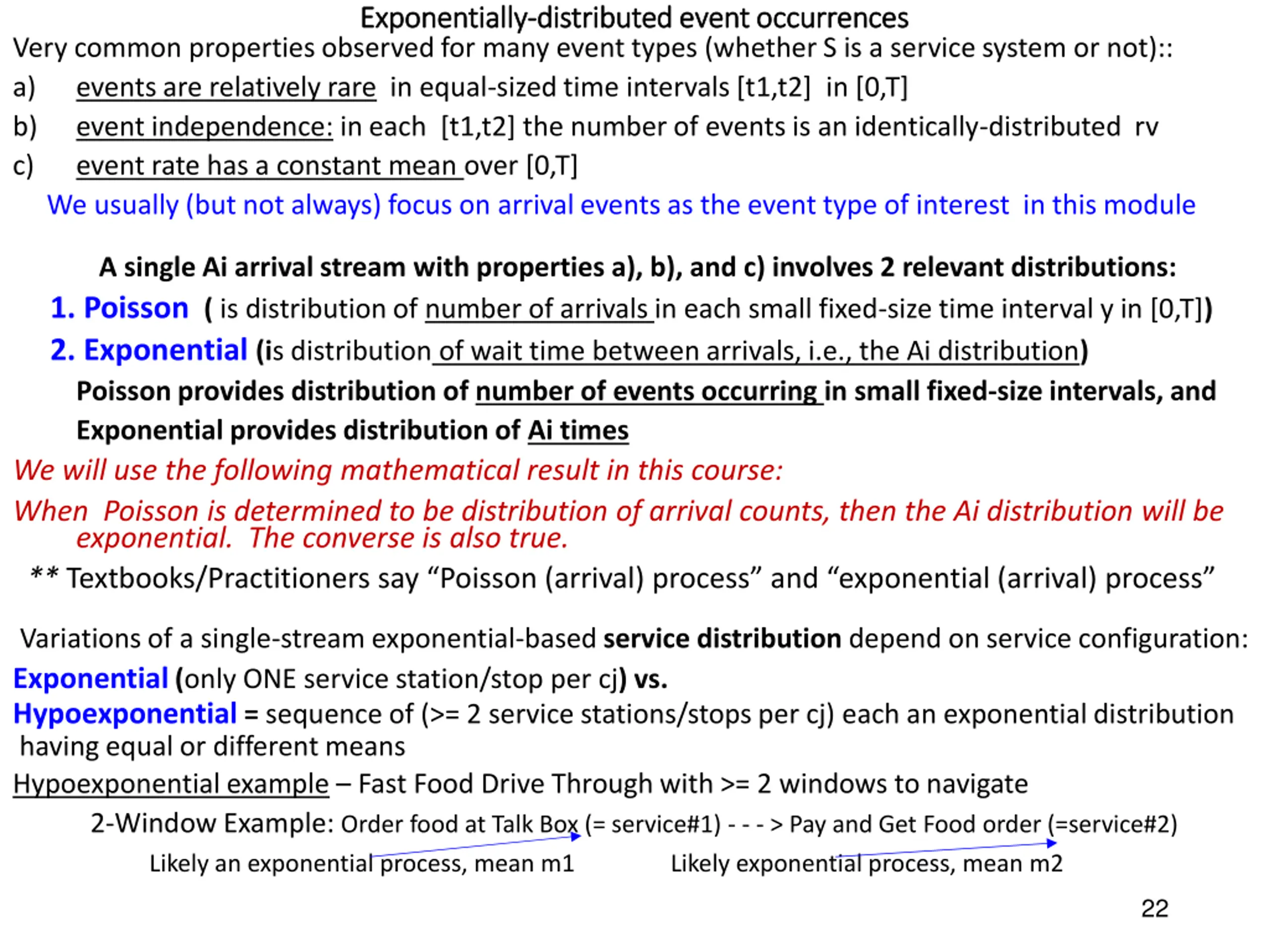 Exponentially Exponentially- -distributed event occurrences distributed event occurrences Very common properties observed for many event types (whether S is a service system or not):: a) events are relatively rare in equal-sized time intervals [t1,t2] in [0,T] b) event independence: in each [t1,t2] the number of events is an identically-distributed rv c) event rate has a constant mean over [0,T] We usually (but not always) focus on arrival events as the event type of interest in this module A single Ai arrival stream with properties a), b), and c) involves2 relevant distributions: 1. Poisson ( isdistribution of number of arrivals in each small fixed-size time interval y in [0,T]) 2. Exponential (is distribution of wait time between arrivals, i.e., the Ai distribution) Poisson provides distribution of number of events occurring in small fixed-size intervals, and Exponential provides distribution of Ai times We will use the following mathematical result in this course: When Poisson is determined to be distribution of arrival counts, then the Ai distribution will be exponential. The converse is also true. ** Textbooks/Practitioners say Poisson (arrival) process and exponential (arrival) process Variations of a single-stream exponential-based service distribution depend on service configuration: Exponential (only ONE service station/stop per cj) vs. Hypoexponential = sequence of (>= 2 service stations/stops per cj)each an exponential distribution having equal or different means Hypoexponential example Fast Food Drive Through with >= 2 windows to navigate 2-Window Example: Order food at Talk Box (= service#1) - - - > Pay and Get Food order (=service#2) Likely an exponential process, mean m1 Likely exponential process, mean m2 22