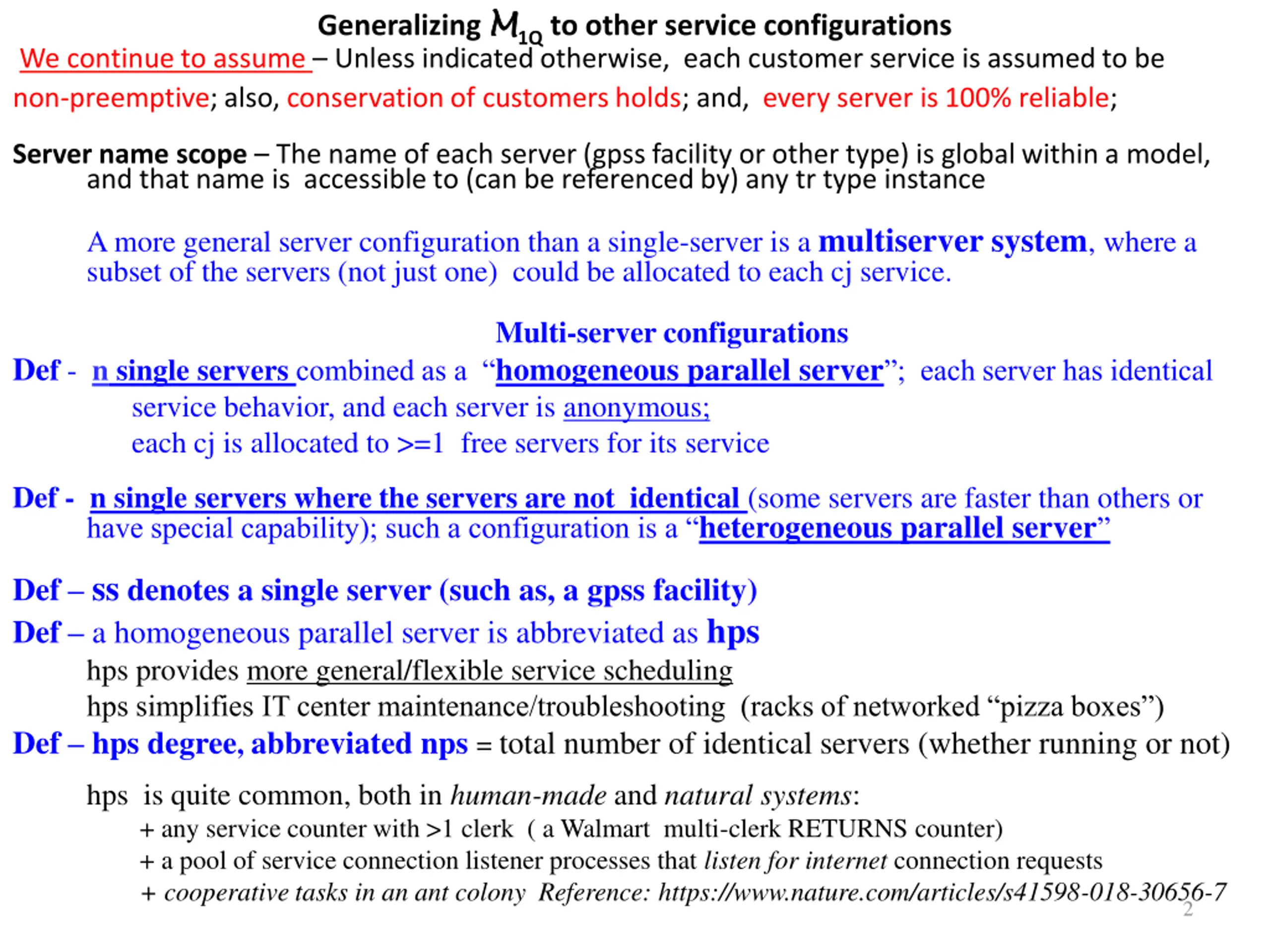 Generalizing M M1Q to other service configurations We continue to assume Unless indicated otherwise, each customer service is assumed to be non-preemptive; also, conservation of customers holds; and, every server is 100% reliable; Server name scope The name of each server (gpss facility or other type) is global within a model, and that name is accessible to (can be referenced by) any tr type instance A more general server configuration than a single-server is a multiserver system, where a subset of the servers (not just one) could be allocated to each cj service. Multi-server configurations Def - n single servers combined as a homogeneous parallel server ; each server has identical service behavior, and each server is anonymous; each cj is allocated to >=1 free servers for its service Def -n single servers where the servers are not identical (some servers are faster than others or have special capability); such a configuration is a heterogeneous parallel server Def ss denotes a single server (such as, a gpss facility) Def a homogeneous parallel server is abbreviated as hps hps provides more general/flexible service scheduling hps simplifies IT center maintenance/troubleshooting (racks of networked pizza boxes ) Def hps degree, abbreviated nps = total number of identical servers (whether running or not) hps is quite common, both in human-made and natural systems: + any service counter with >1 clerk ( a Walmart multi-clerk RETURNS counter) + a pool of service connection listener processes that listen for internet connection requests + cooperative tasks in an ant colony Reference: https://www.nature.com/articles/s41598-018-30656-7 2