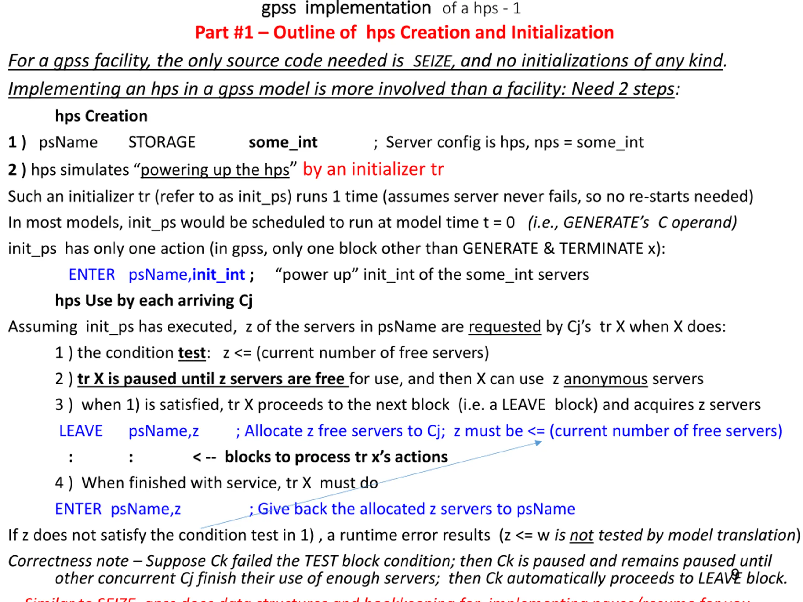 gpss implementation gpss implementationof a hps - 1 Part #1 Outline of hps Creation and Initialization For a gpss facility, the only source code needed is SEIZE, and no initializations of any kind. Implementing an hps in a gpss model is more involved than a facility: Need 2 steps: hps Creation 1 ) psName STORAGE some_int 2 ) hps simulates powering up the hps by an initializer tr Such an initializer tr (refer to as init_ps) runs 1 time (assumes server never fails, so no re-starts needed) In most models, init_ps would be scheduled to run at model time t = 0 (i.e., GENERATE s C operand) init_ps has only one action (in gpss, only one block other than GENERATE & TERMINATE x): ENTER psName,init_int ; power up init_int of the some_int servers hps Use by each arriving Cj Assuming init_ps has executed, z of the servers in psName are requested by Cj s tr X when X does: 1 ) the condition test: z <= (current number of free servers) 2 ) tr X is paused until z servers are free for use, and then X can use z anonymous servers 3 ) when 1) is satisfied, tr X proceeds to the next block (i.e. a LEAVE block) and acquires z servers LEAVE psName,z ; Allocate z free servers to Cj; z must be <= (current number of free servers) : : < -- blocks to process tr x s actions 4 ) When finished with service, tr X must do ENTER psName,z ; Give back the allocated z servers to psName If z does not satisfy the condition test in 1) , a runtime error results (z <= w is not tested by model translation) Correctness note Suppose Ck failed the TEST block condition; then Ck is paused and remains paused until other concurrent Cj finish their use of enough servers; then Ck automatically proceeds to LEAVE block. Similar to SEIZE, gpss does data structures and bookkeeping for implementing pause/resume for you ; Server config is hps, nps = some_int 9