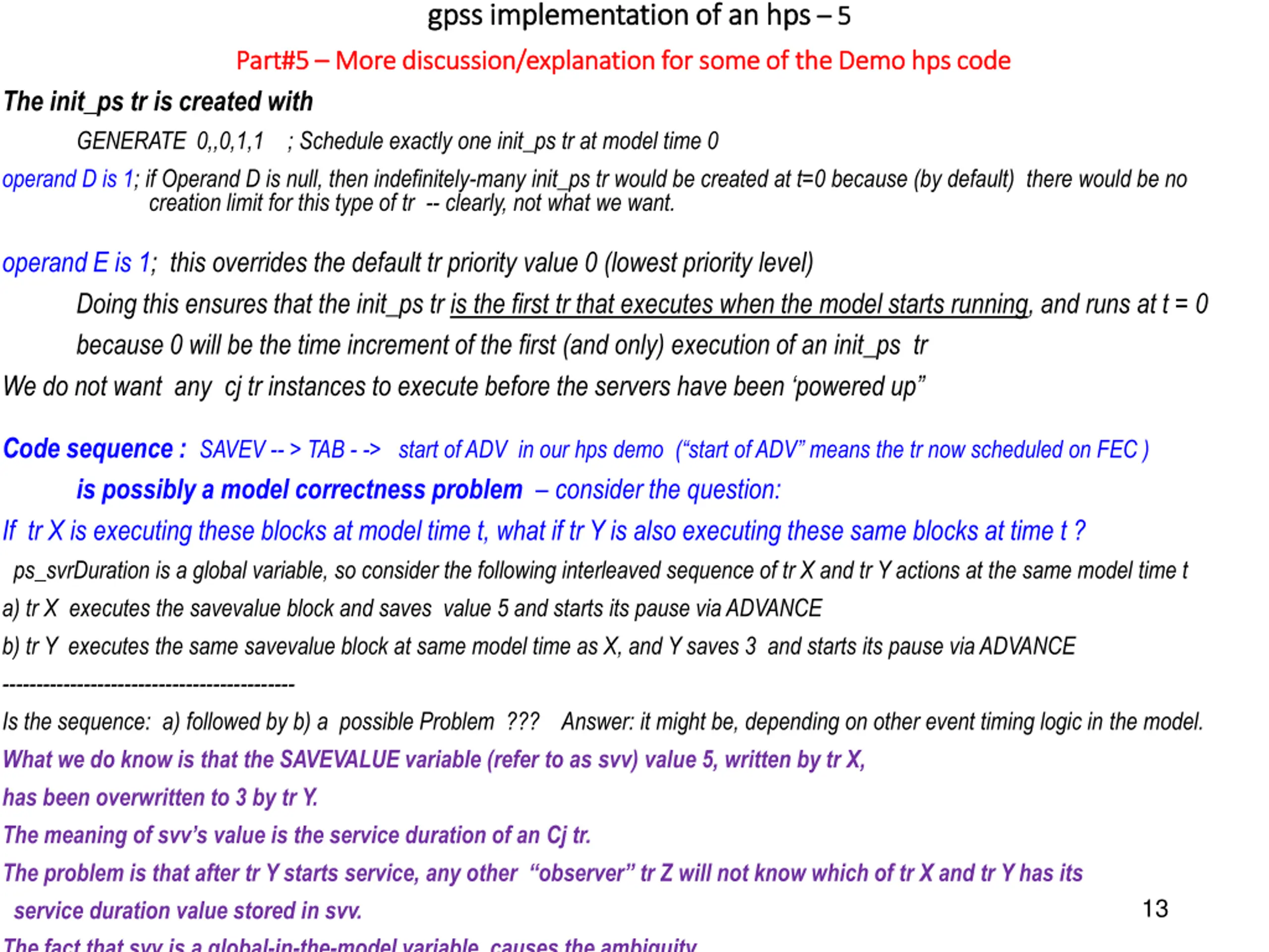 gpss implementation of an gpss implementation of an hps hps 5 5 Part#5 Part#5 More discussion/explanation for some of the Demo More discussion/explanation for some of the Demo hps The init_ps tr is created with GENERATE 0,,0,1,1 ; Schedule exactly one init_ps tr at model time 0 operand D is 1; if Operand D is null, then indefinitely-many init_ps tr would be created at t=0 because (by default) there would be no creation limit for this type of tr -- clearly, not what we want. hps code code operand E is 1; this overrides the default tr priority value 0 (lowest priority level) Doing this ensures that the init_ps tr is the first tr that executes when the model starts running, and runs at t = 0 because 0 will be the time increment of the first (and only) execution of an init_ps tr We do not want any cj tr instances to execute before the servers have been powered up Code sequence : SAVEV -- > TAB - -> start of ADV in our hps demo ( start of ADV means the tr now scheduled on FEC ) is possibly a model correctness problem consider the question: If tr X is executing these blocks at model time t, what if tr Y is also executing these same blocks at time t ? ps_svrDuration is a global variable, so consider the following interleaved sequence of tr X and tr Y actions at the same model time t a) tr X executes the savevalue block and saves value 5 and starts its pause via ADVANCE b) tr Y executes the same savevalue block at same model time as X, and Y saves 3 and starts its pause via ADVANCE ------------------------------------------- Is the sequence: a) followed by b) a possible Problem ??? Answer: it might be, depending on other event timing logic in the model. What we do know is that the SAVEVALUE variable (refer to as svv) value 5, written by tr X, has been overwritten to 3 by tr Y. The meaning of svv s value is the service duration of an Cj tr. The problem is that after tr Y starts service, any other observer tr Z will not know which of tr X and tr Y has its service duration value stored in svv. The fact that svv is a global-in-the-model variable causes the ambiguity. 13